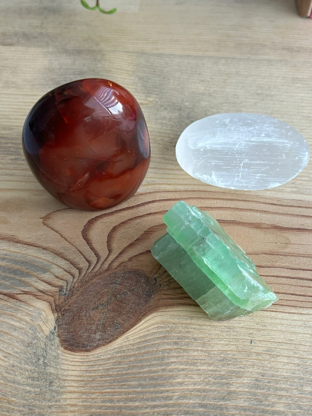 Selling a collection of crystals! There's a carnelian, selenite, and green calcite piece. Perfect for anyone interested in crystals or starting a collection