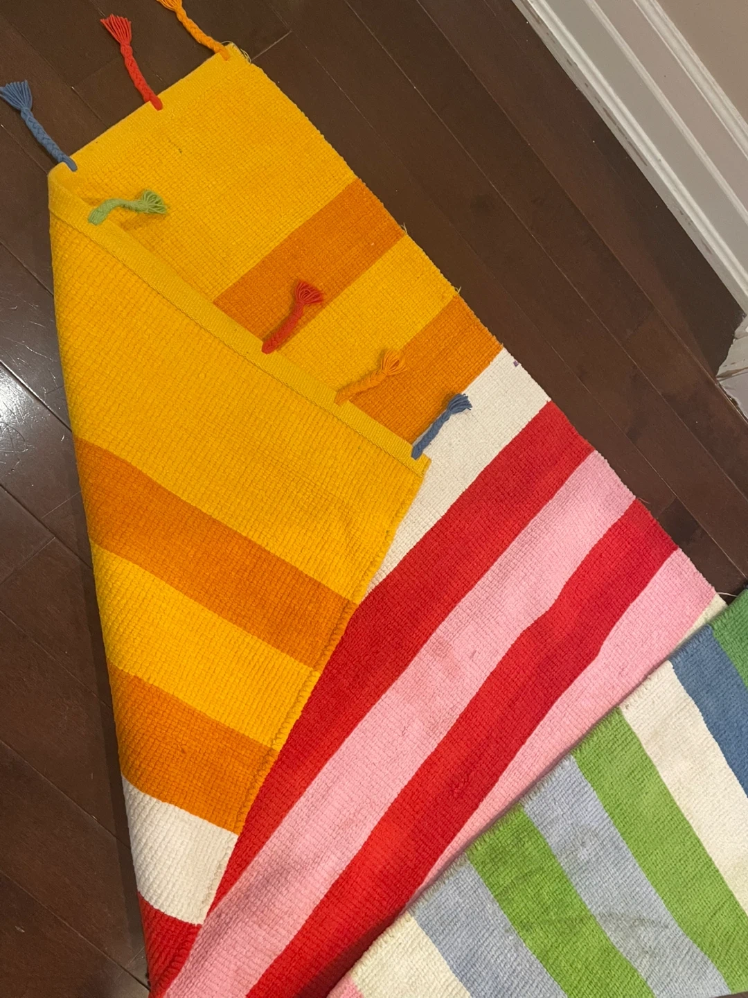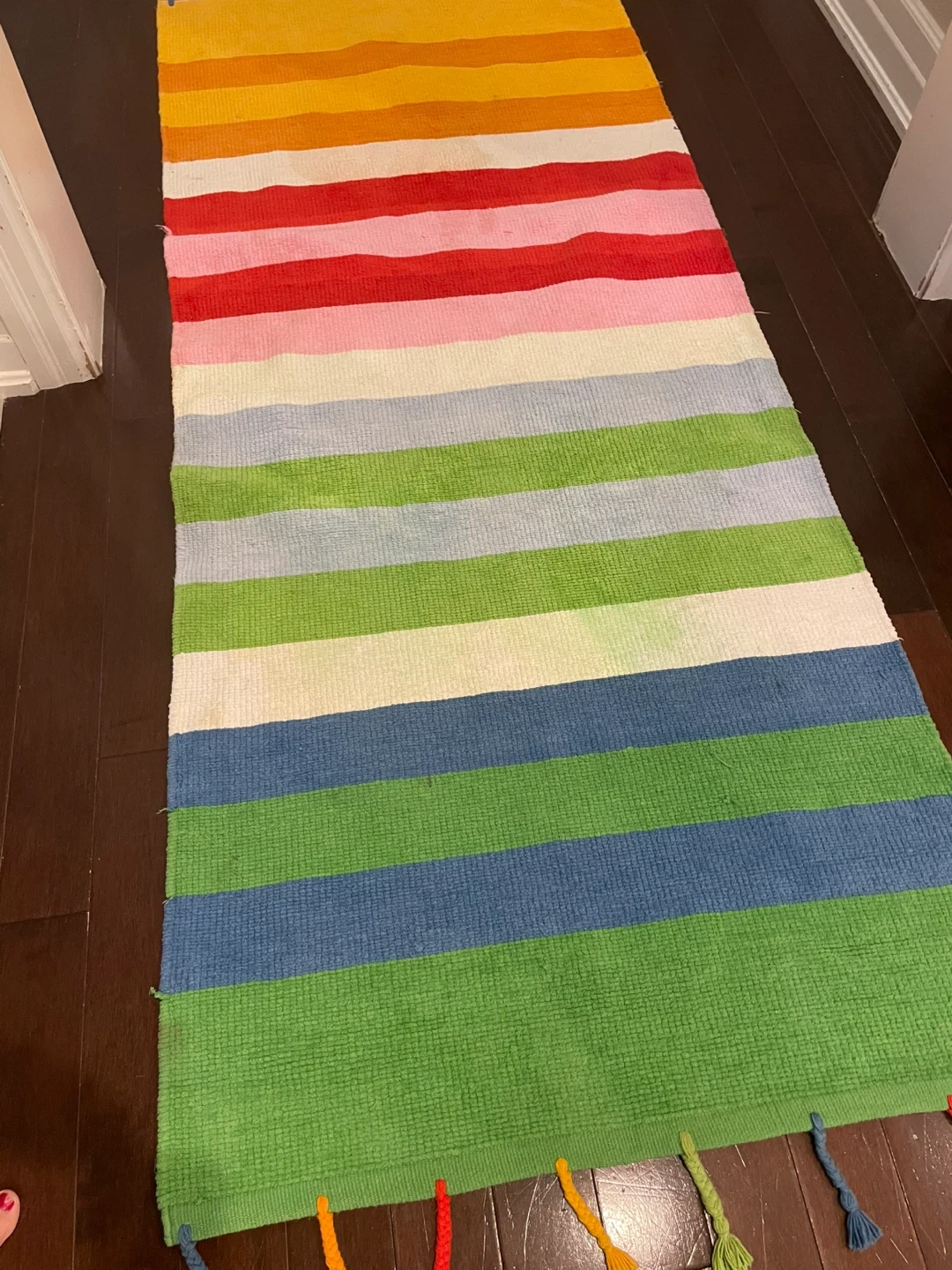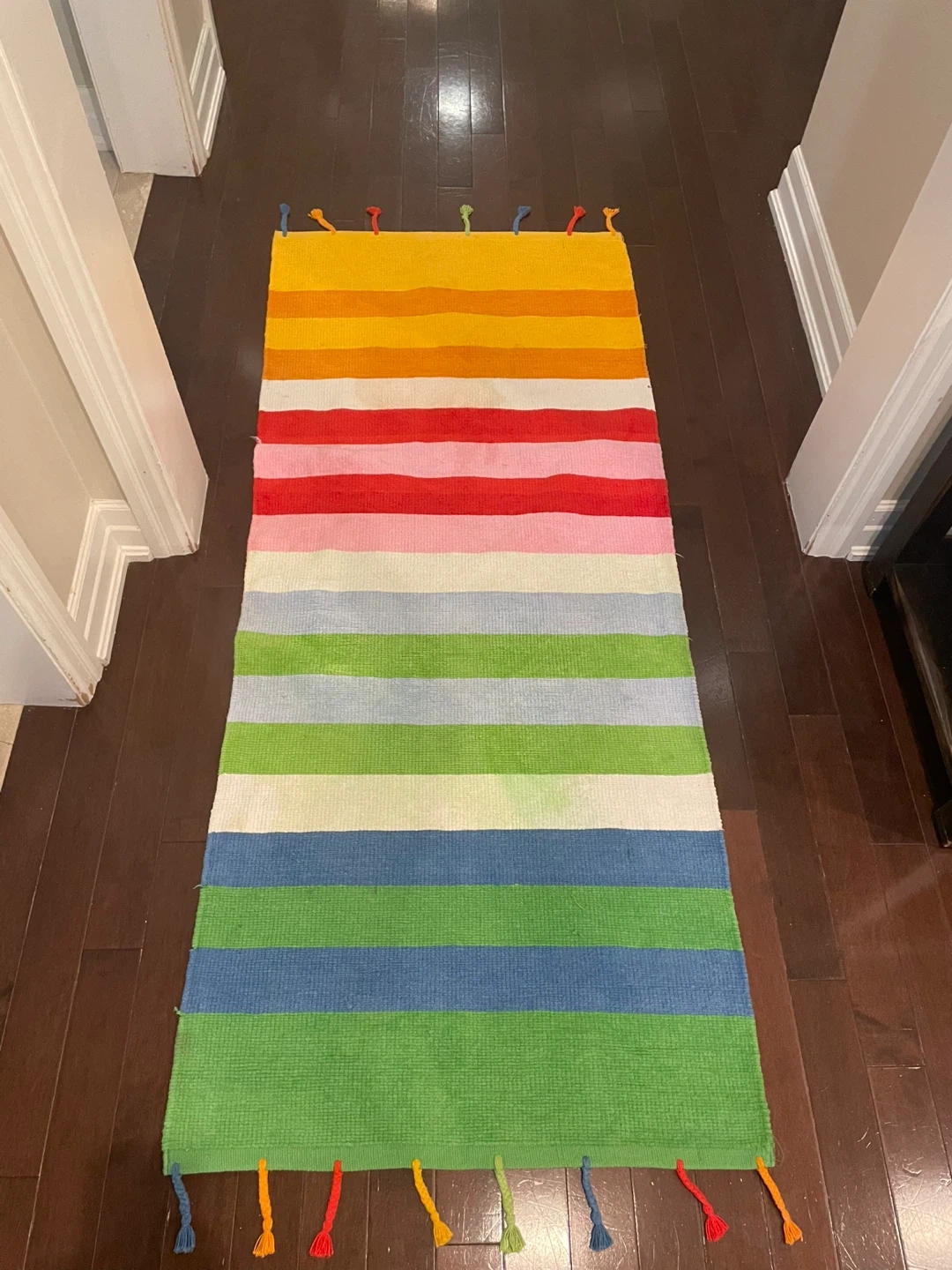 FLOOR RUNNER. BEAUTIFUL COTTON KNOTTED. GREAT FOR KIDS PLAYROOM OR FOR ANY ROOM. Vibrant colours. See pictures. Size: 60” long x 30” wide. Clean and from smoke free, pet free home. Pick up I’m Scarborough . Midland And Eglinton