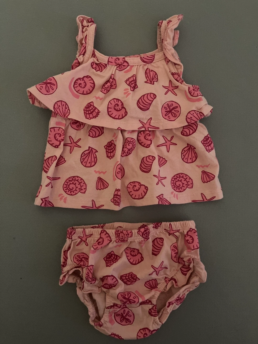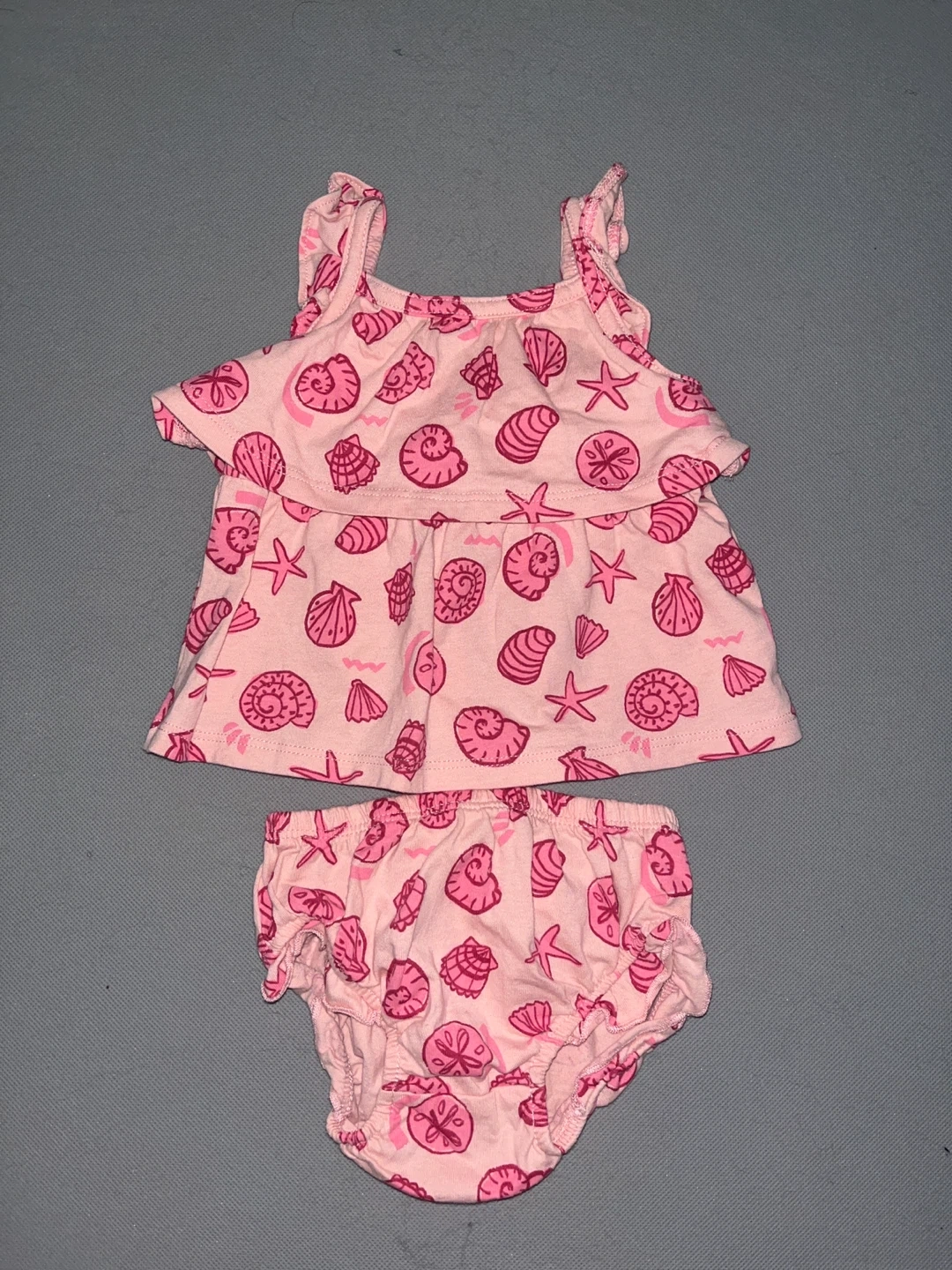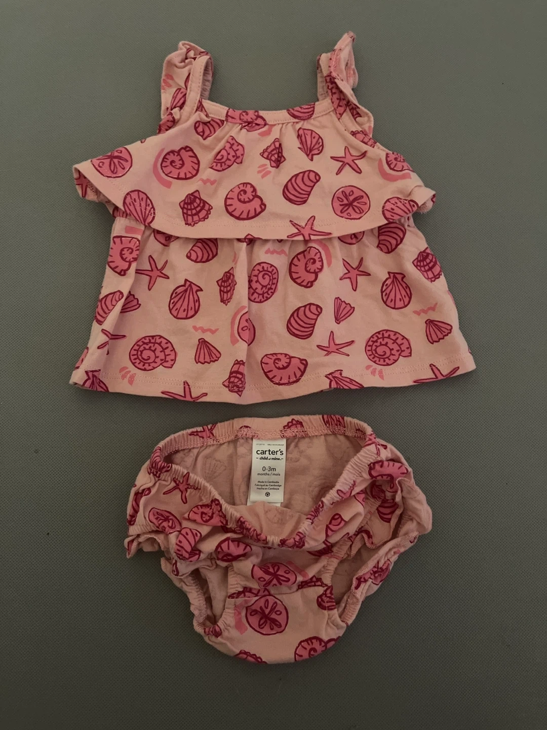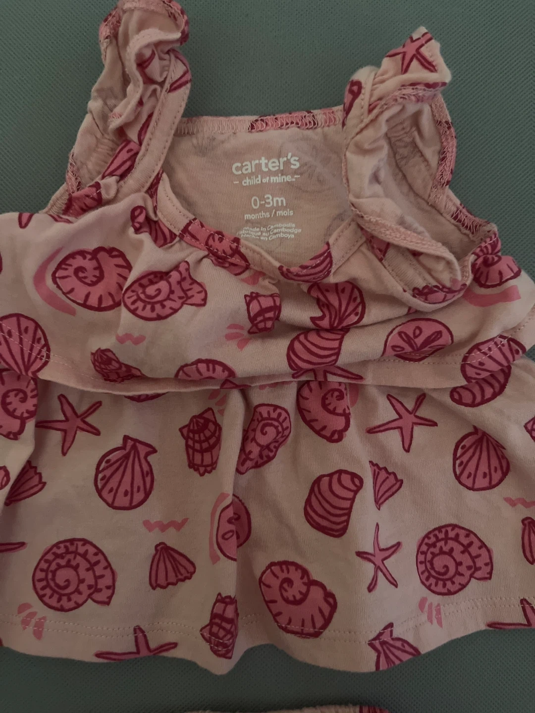 Super cute Carter's Child of Mine baby outfit! It's a size 0-3 months and features a pink seashell and starfish pattern. Perfect for your little one!