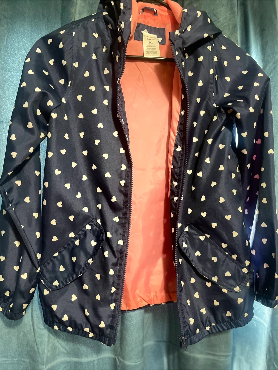 This adorable Carter's rain jacket is perfect for keeping your little one dry and stylish! It features a cute heart print design on a navy blue background. The jacket is a size 10 and has a hood for extra protection. It's in great condition and ready for its next adventure!