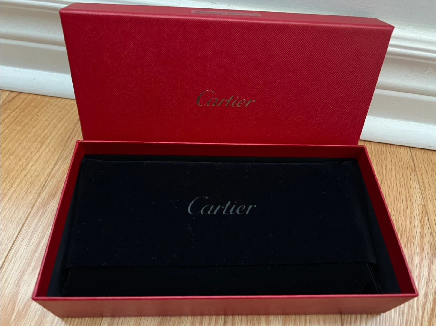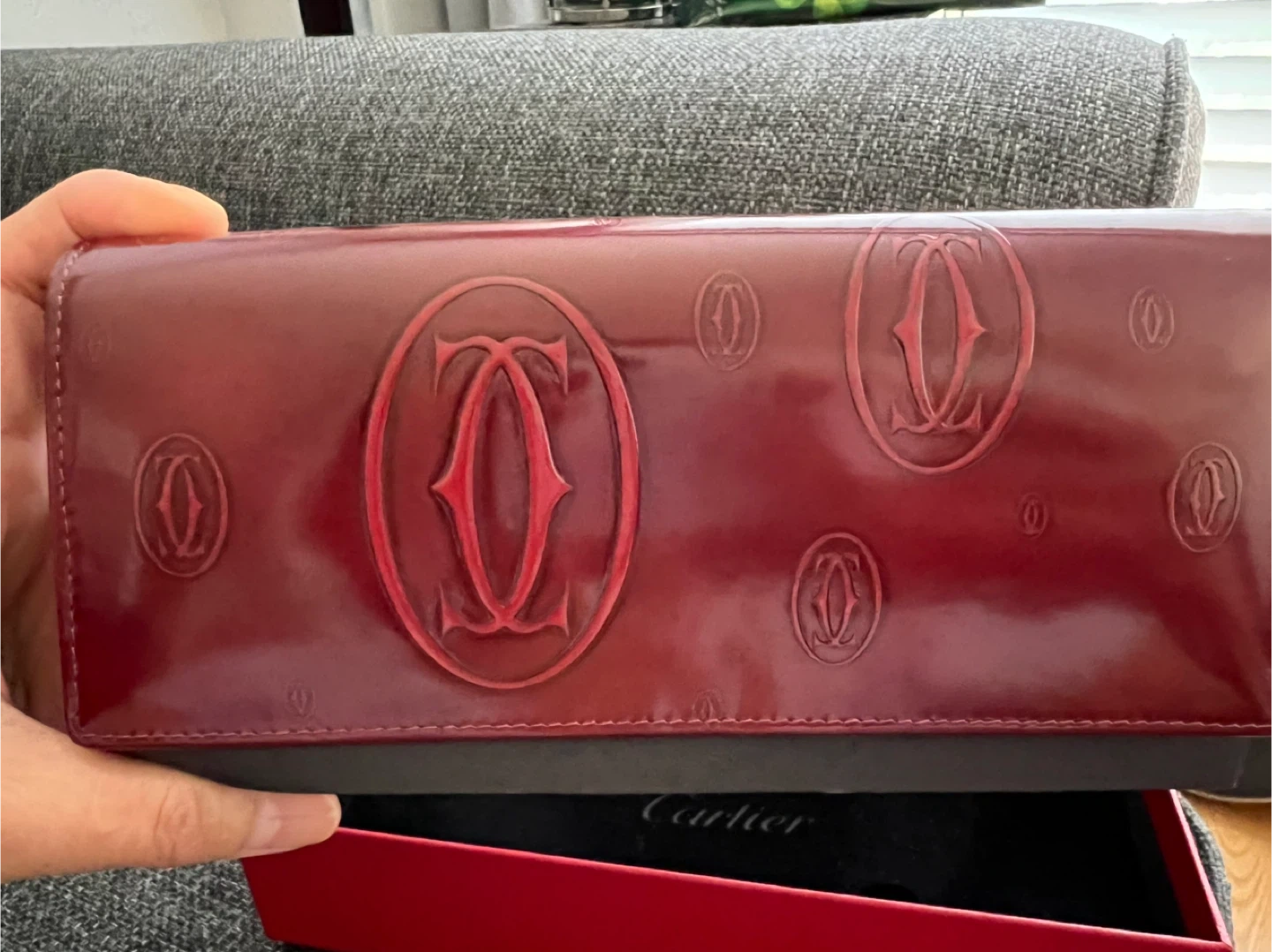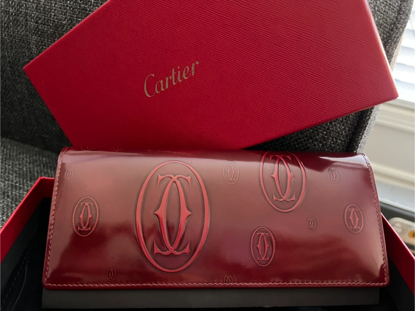 Selling a beautiful Cartier wallet in red patent leather. It features the iconic Cartier logo design. Comes with the original box and dust bag, perfect for keeping it safe. A stylish and functional accessory!