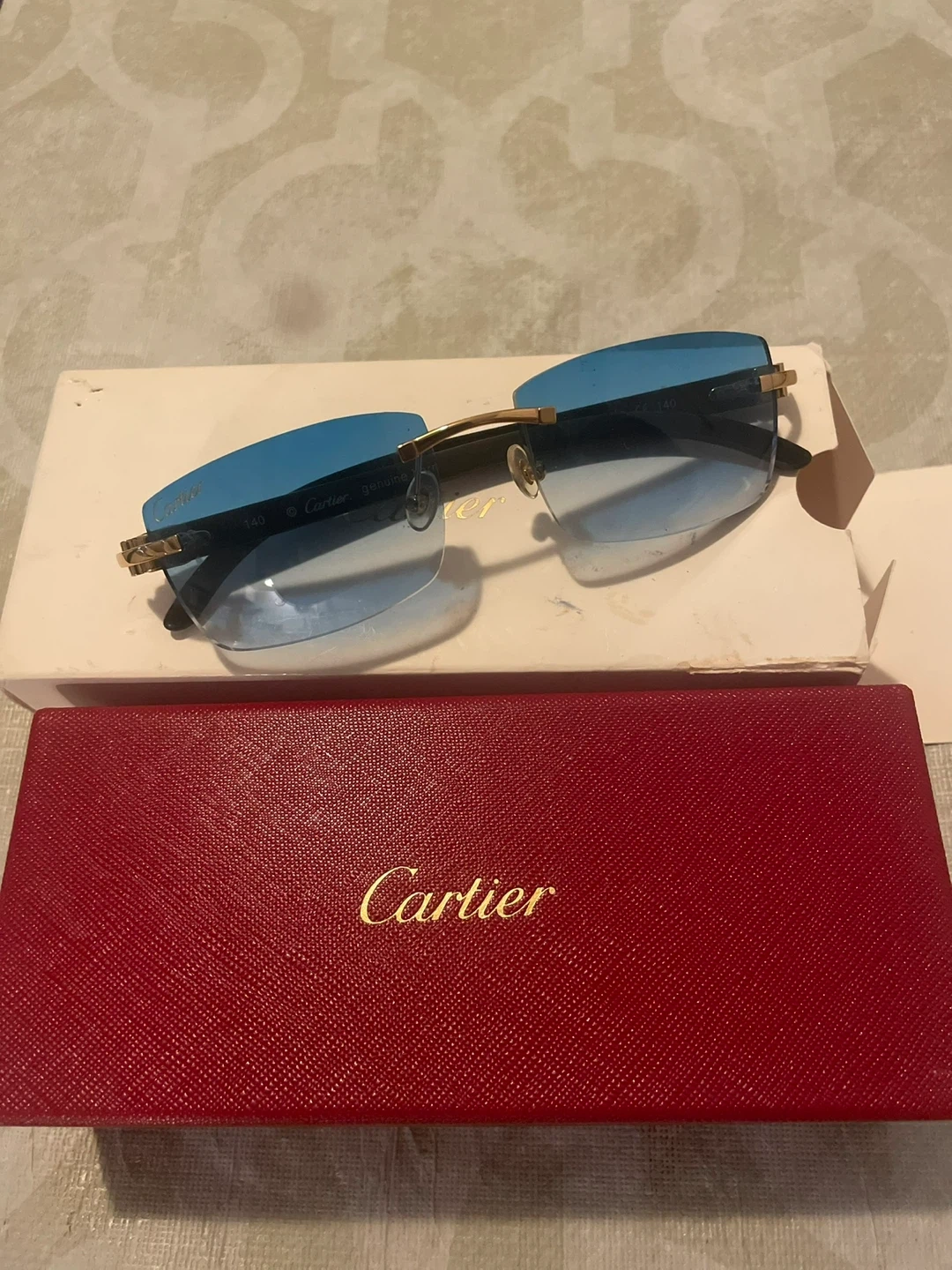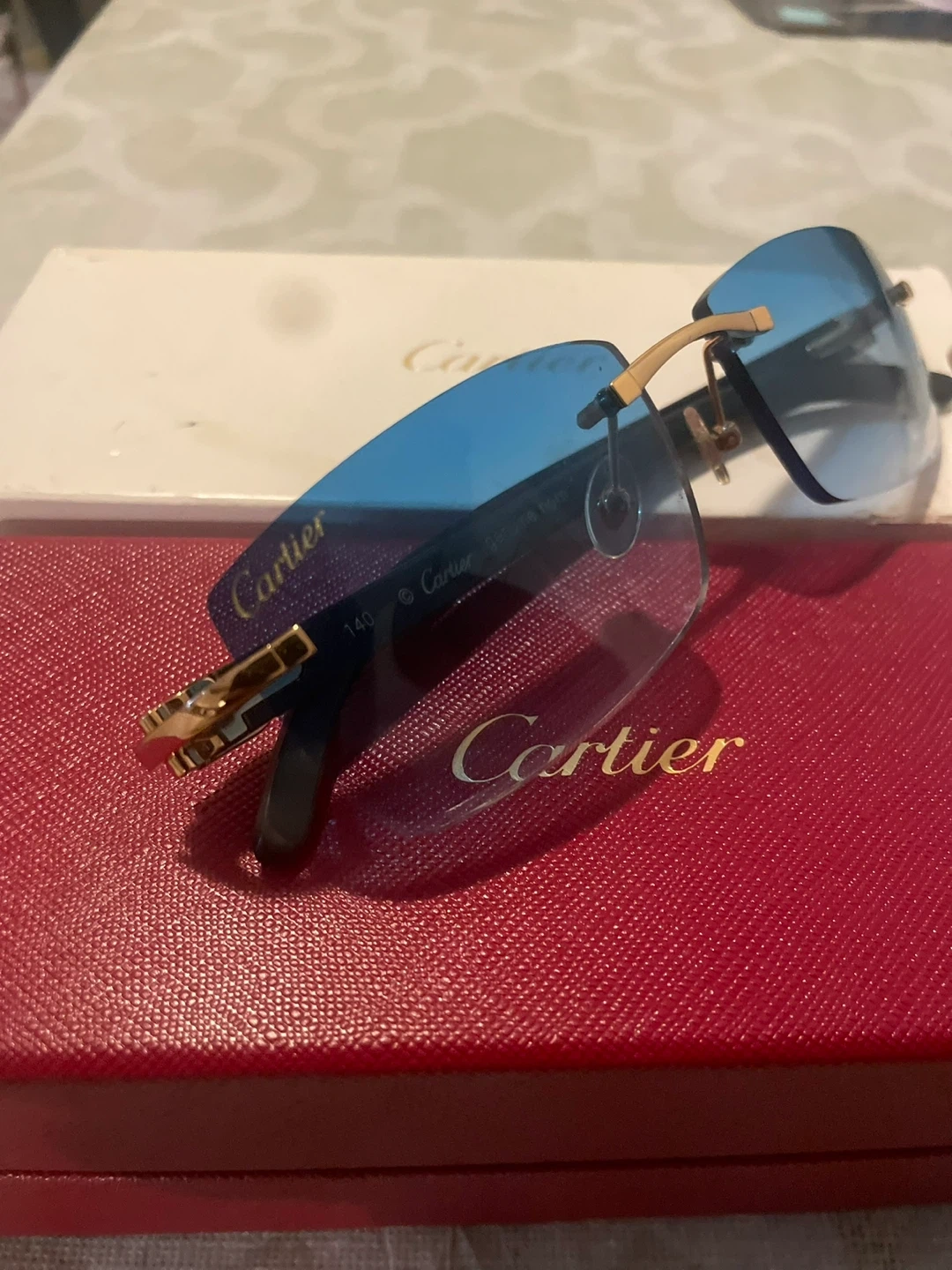 Selling a pair of Cartier rimless sunglasses. They come with the original box. The lenses are a stylish blue gradient. These sunglasses are in great condition and ready for a new home!