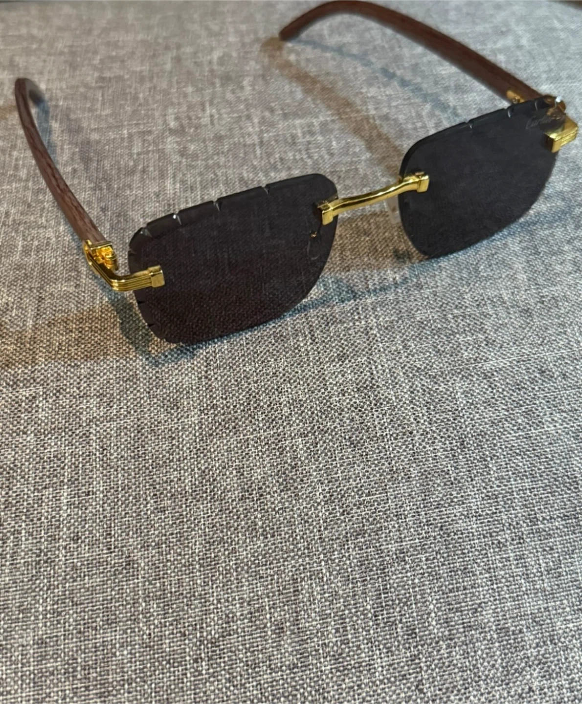 Selling a pair of Cartier sunglasses. They feature a rimless design with gold accents and brown wooden arms. They are in great condition! Doesn’t come with a box so I’ll provide you with one also brand new hasn’t been worn once.Prices negotiable
