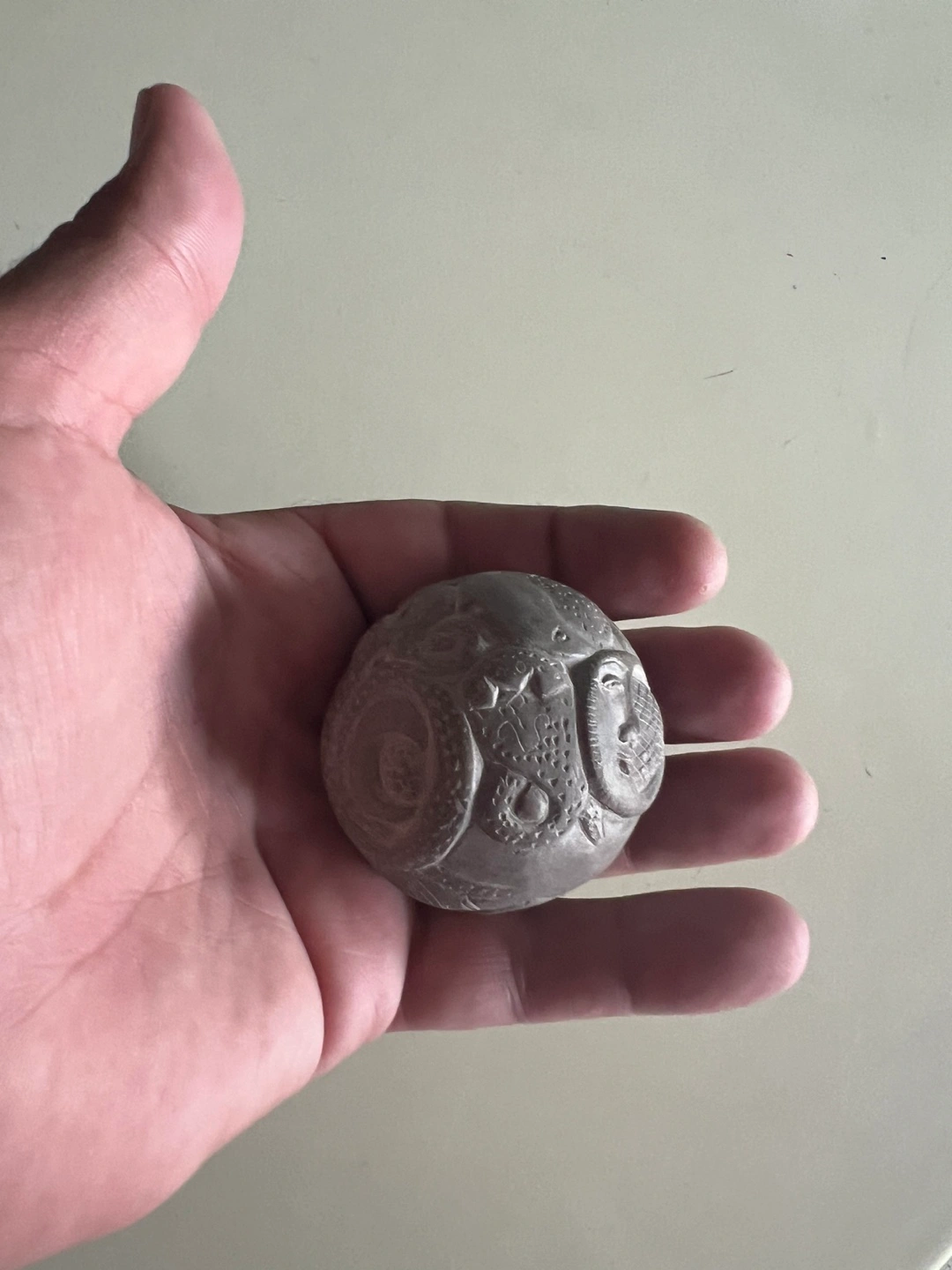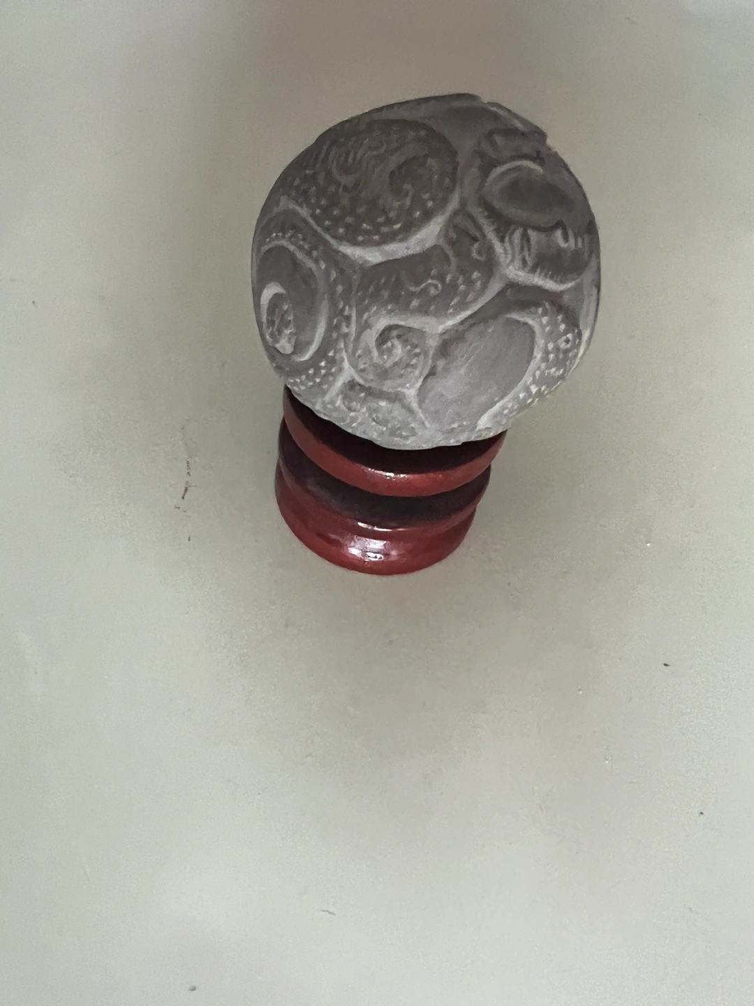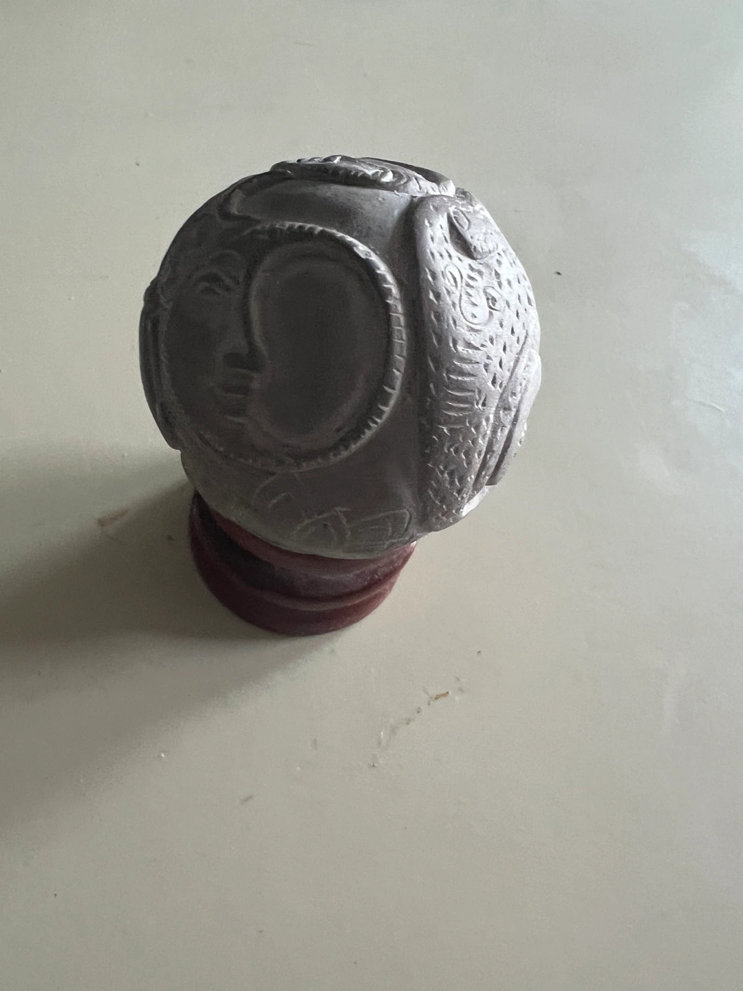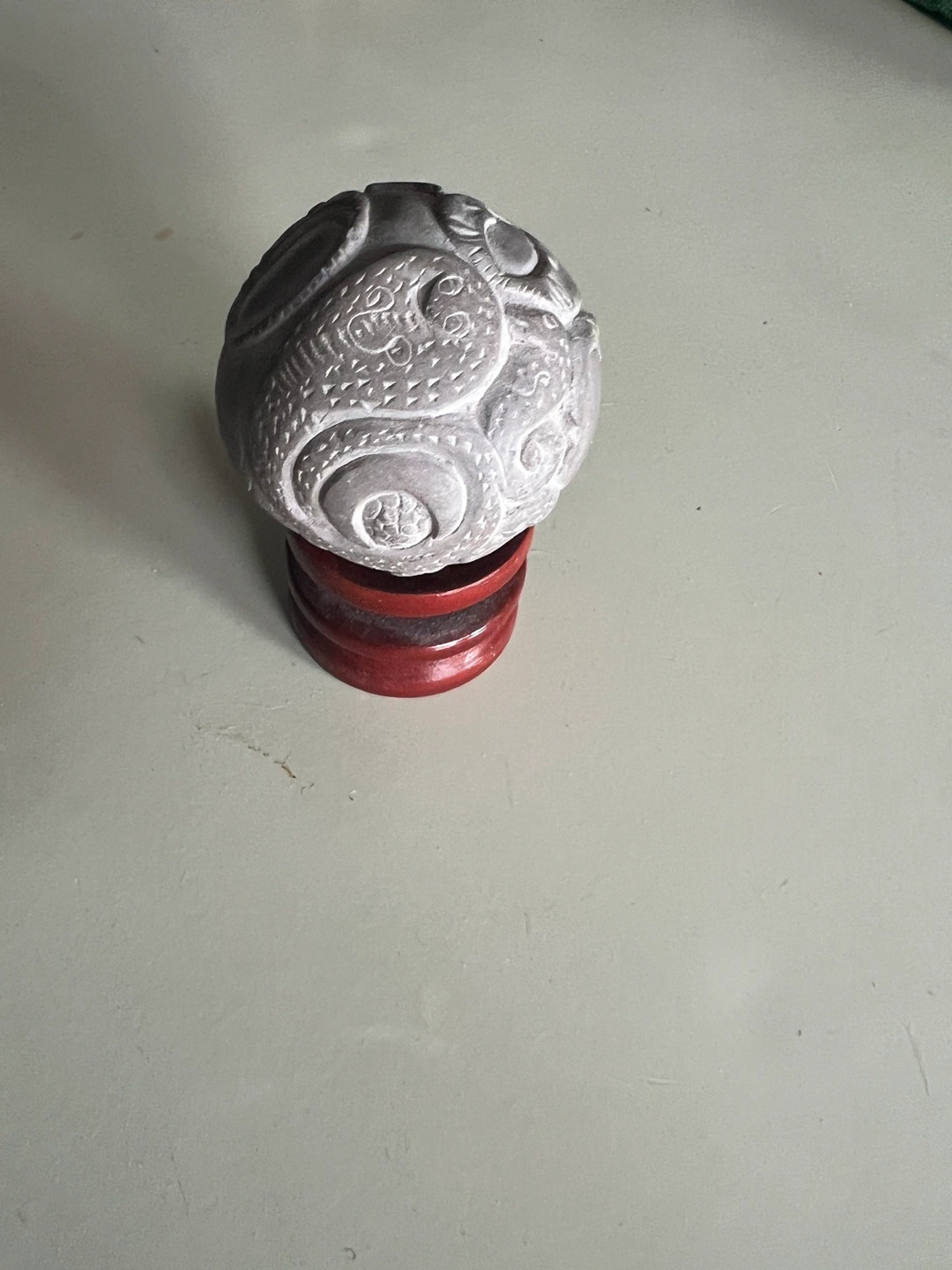 I'm selling a unique carved stone ball that comes with a wooden stand. The stone has intricate designs carved into it, making it a very interesting piece. It would look great as a decorative item in your home!