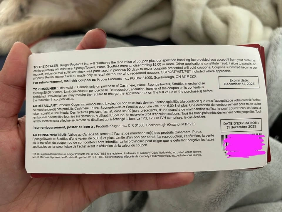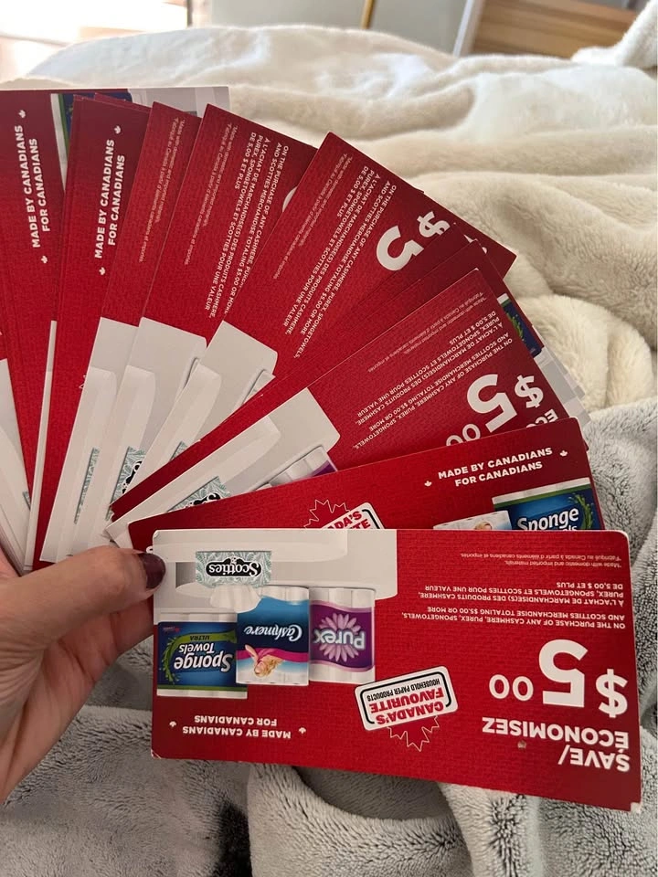 I have a bunch of $5 coupons. They are valid in Canada on the purchase of Cashmere, Purex, SpongeTowels, and Scotties merchandise totaling $5 or more, making your purchase almost free. The expiry date is December 31, 2025 Selling for 3$ each and 2$ on taking 10 or more Will give all 26 for 50$ Pick up close to bay and temperance