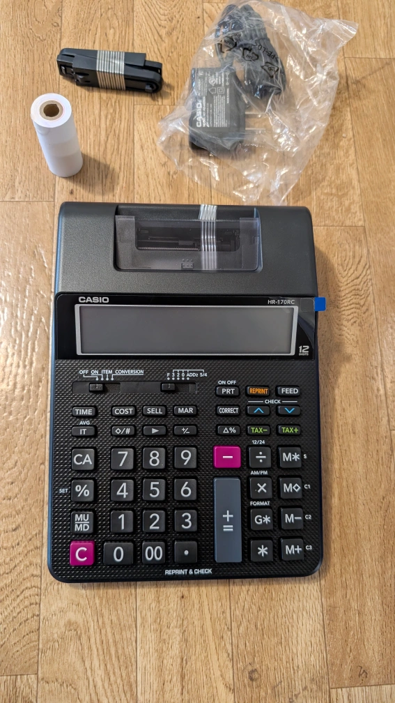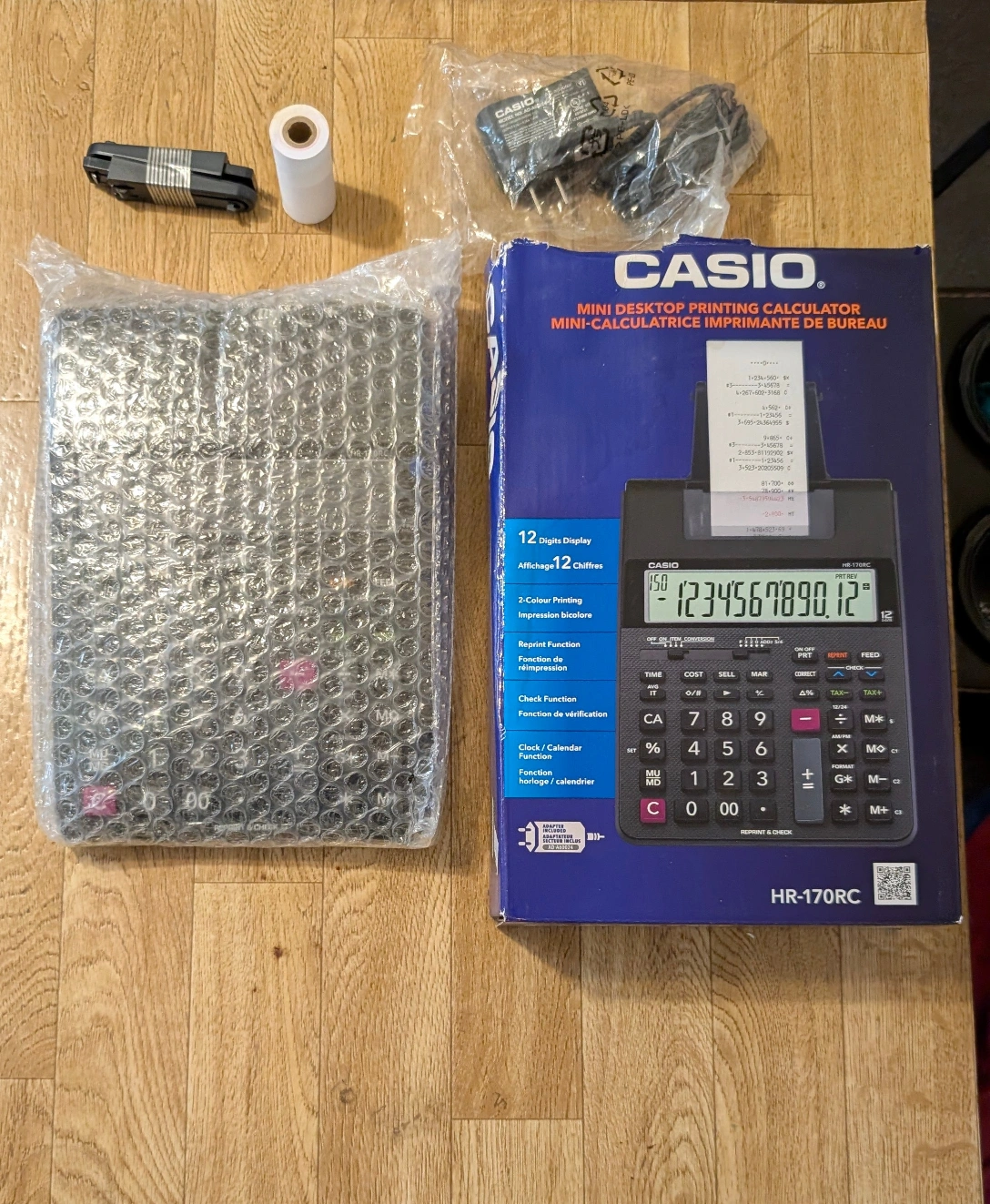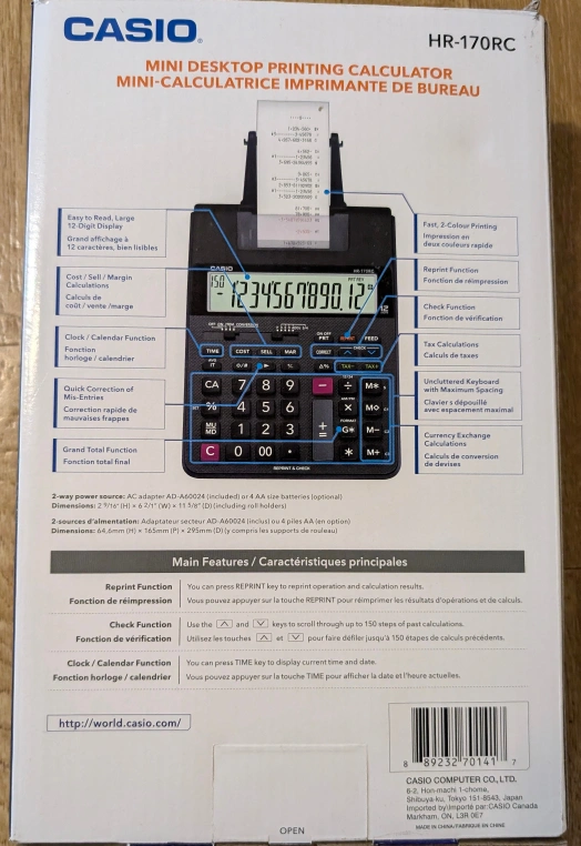 Casio desktop printing calculator HR-170RC New with box (opened to show). Comes with AC power adapter or can use 4AA batteries. Also comes with 1st roll of paper roll.
