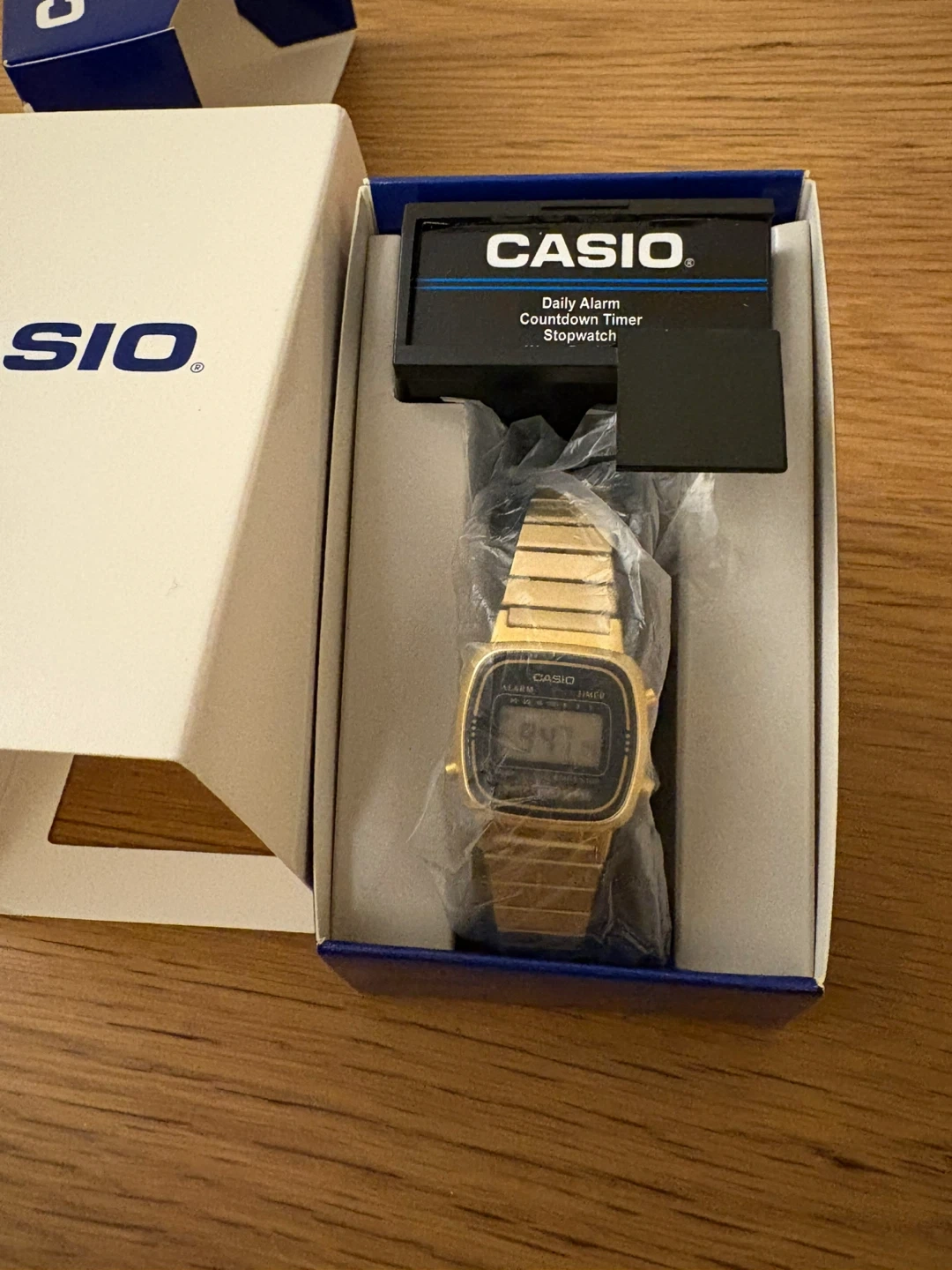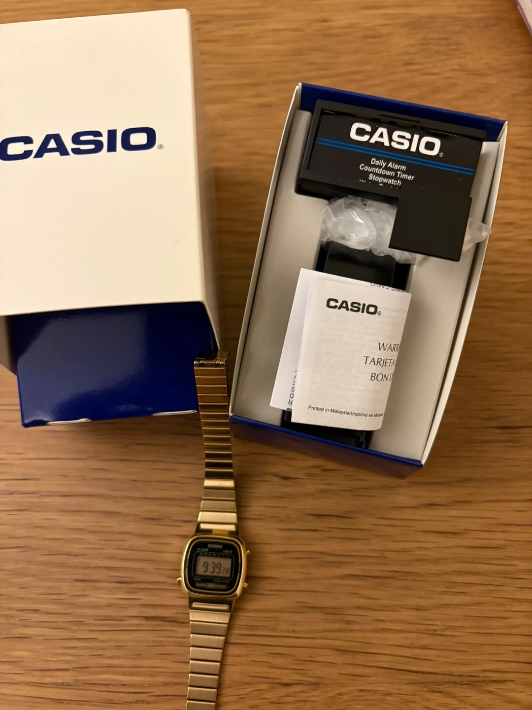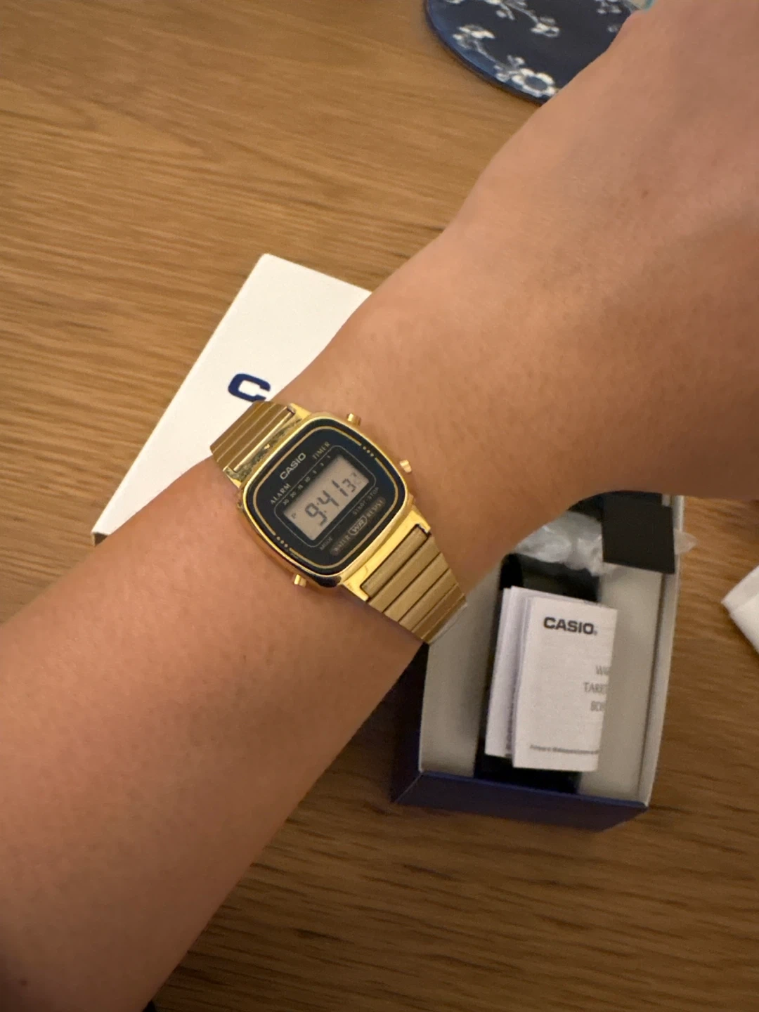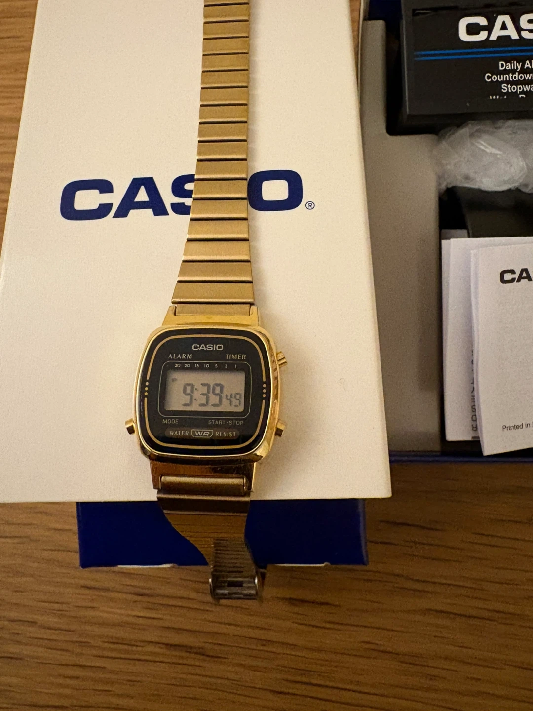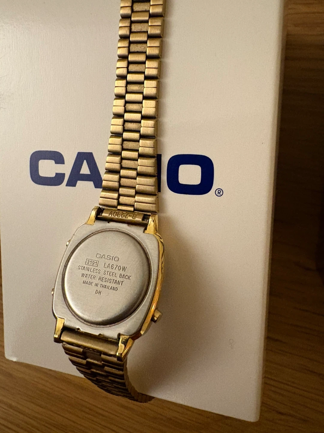 Selling a classic Casio LA670W digital watch in gold! This vintage-style watch features a stainless steel back and is water-resistant. It comes with the original box and instructions. Great condition! Please note this model has the dainty small retro screen and also it does not come with backlight.