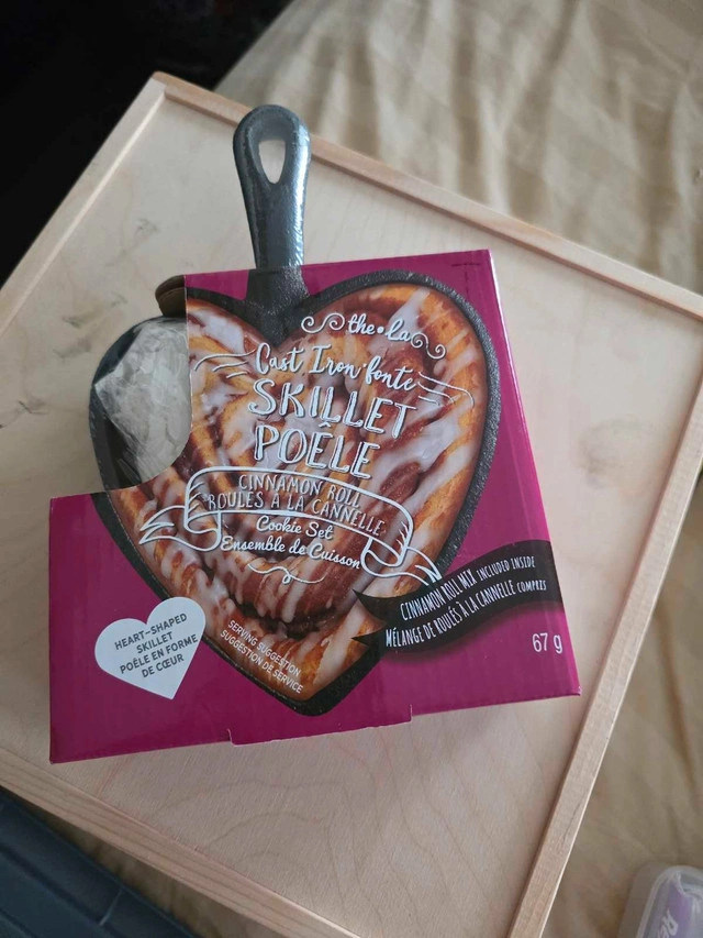 I'm selling a brand new, in-box, cast iron heart shaped cinnamon roll pan, perfect for baking a sweet treat for someone special. The cast iron construction ensures even heating for perfectly cooked cinnamon rolls every time. Here are some details: * Heart-shaped design * Cast iron material * Cinnamon roll mix included * 67g This pan would normally cost you $25. It is in new condition. If the ad is still up, it's still available!