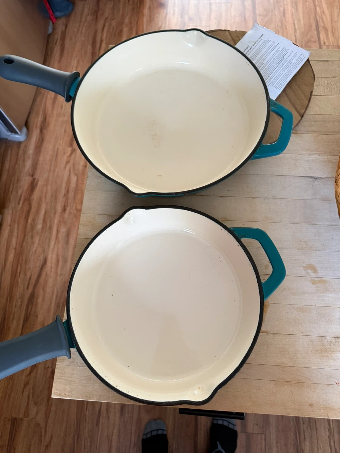 Selling a set of two enameled cast iron skillets. They are in good condition and ready for your next culinary adventure! Both skillets feature a durable construction and are perfect for searing, frying, and baking. The enamel interior makes them easy to clean and maintain. Brand Tramontina