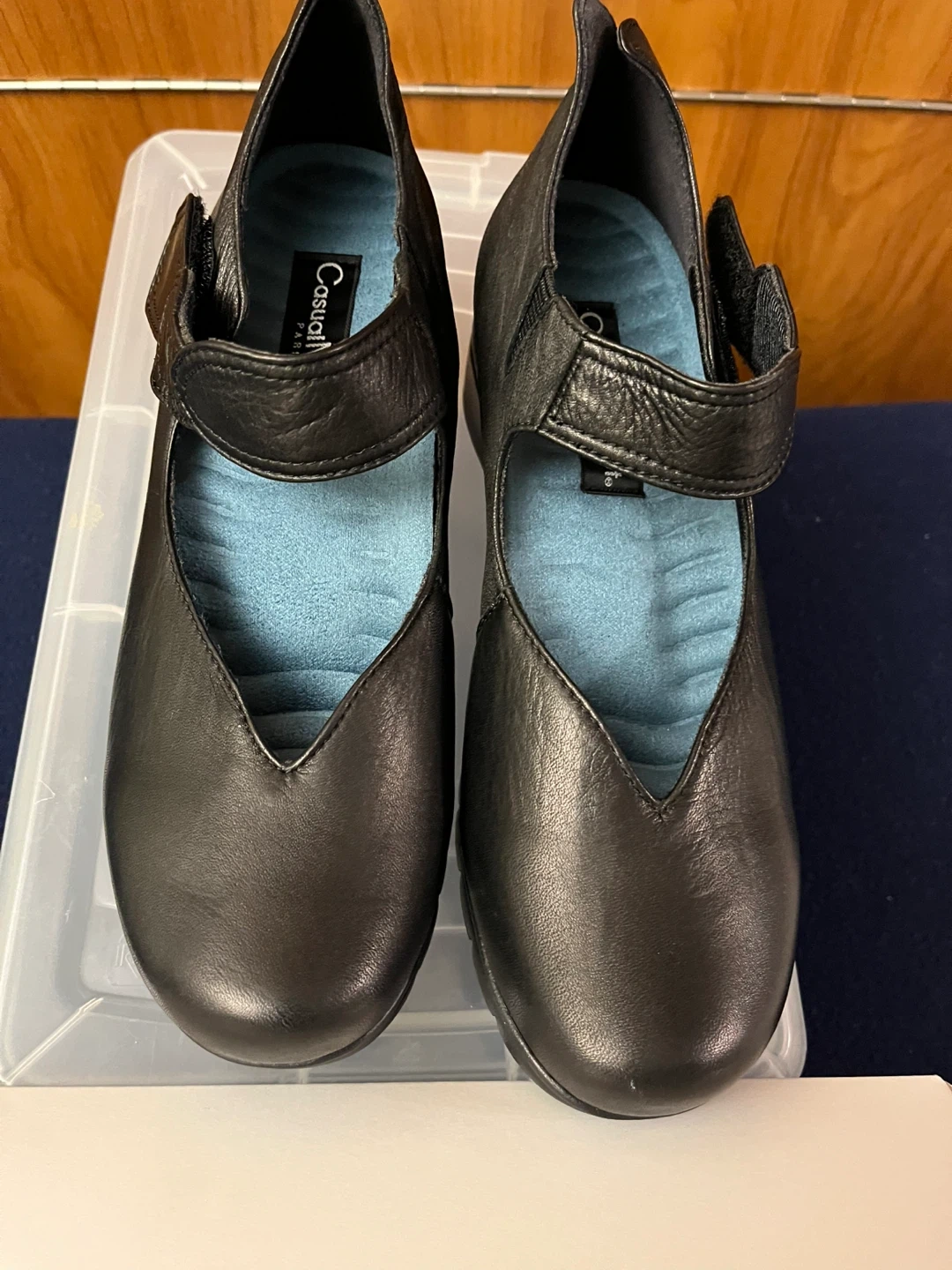 Selling a pair of Casual Paris Mary Janes in black leather. They feature a classic design with a strap and buckle closure. The shoes have a comfortable fit and are in good condition. Perfect for everyday wear!