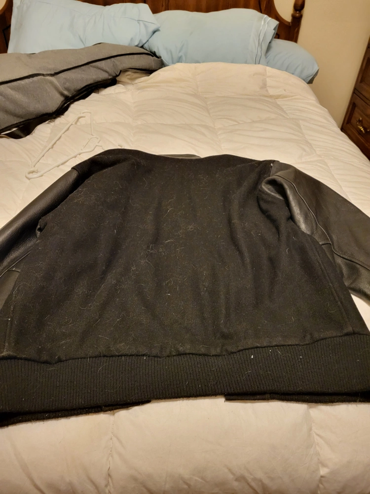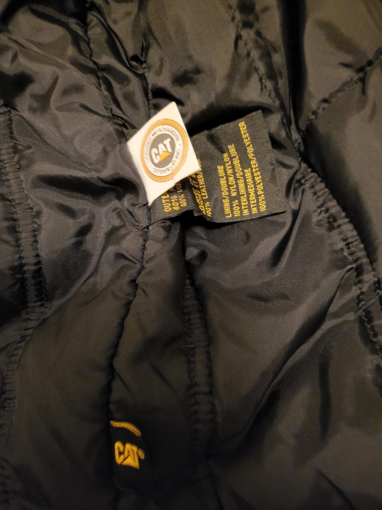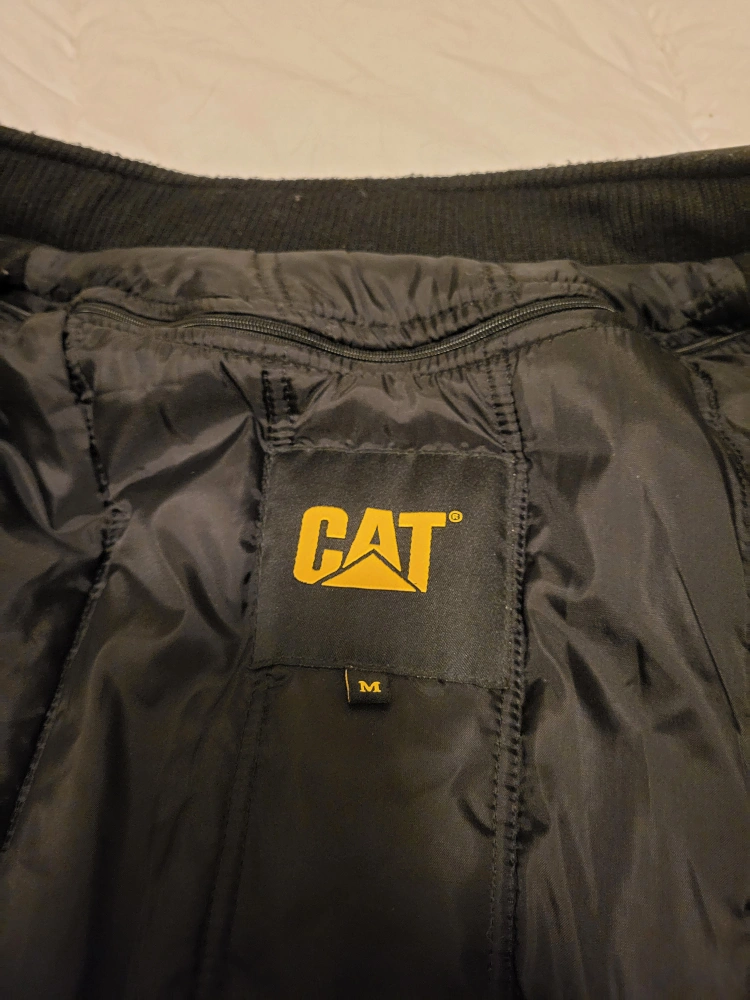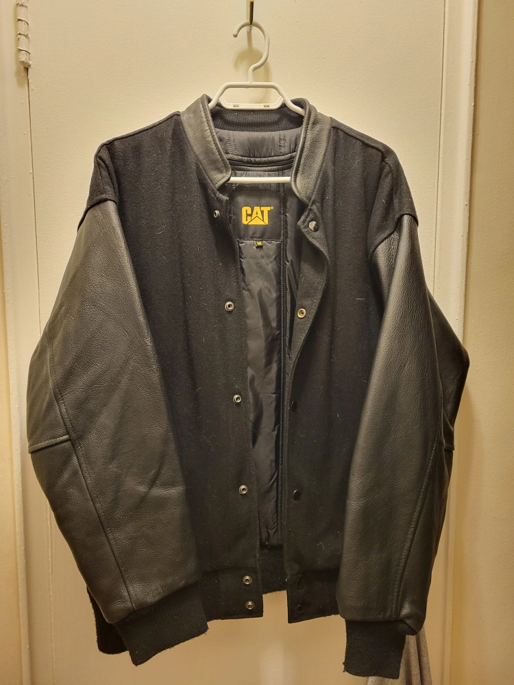 Selling a CAT jacket in great condition! It's a size medium and features a combination of black leather sleeves and a wool blend body. The lining is 100% polyester, while the outer shell is 60% wool and 40% leather. It's a stylish and durable jacket for cooler weather