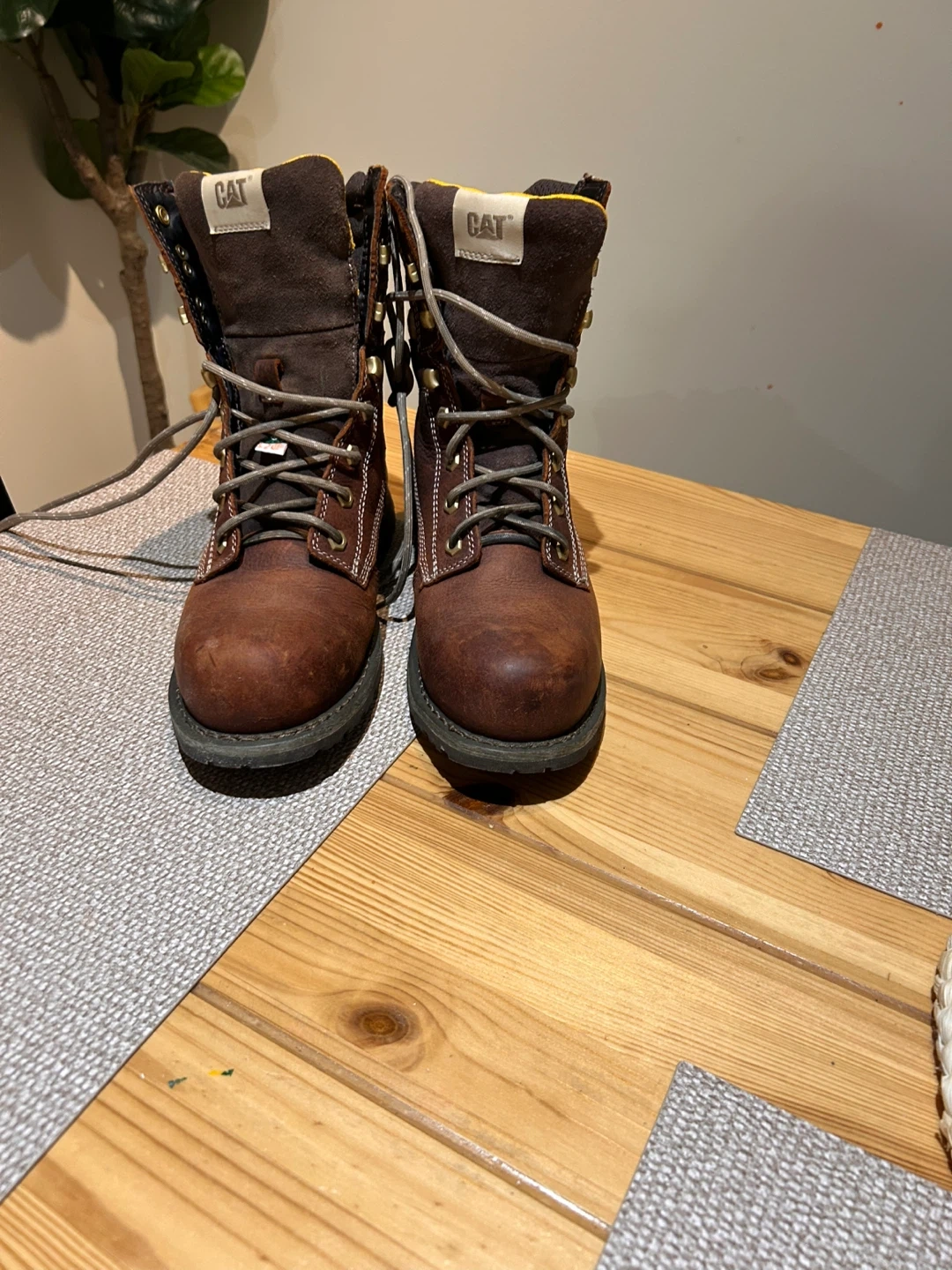 Selling a pair of CAT work boots in brown leather. They're in good condition.