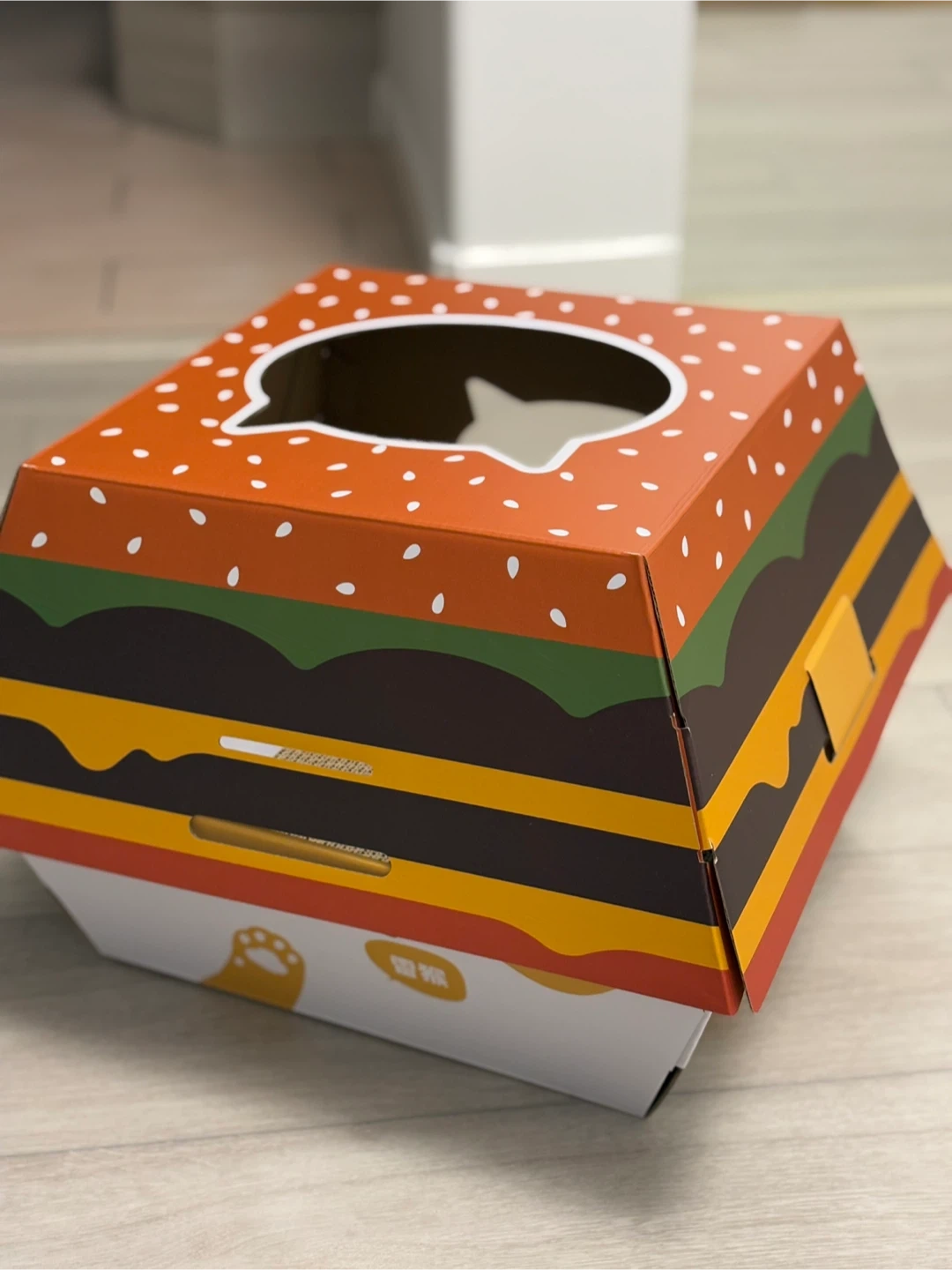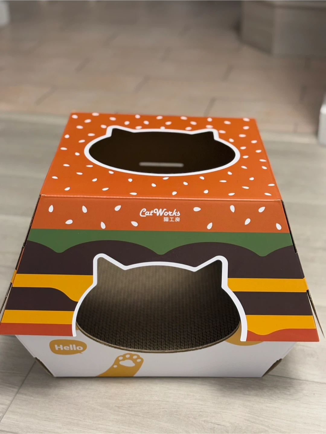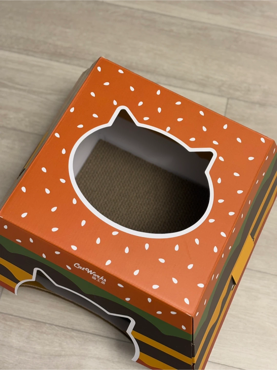 Selling a fun burger-themed cat scratcher box from CatWorks! It's in great shape and ready for a new feline friend to enjoy. The box is designed like a hamburger, complete with sesame seeds on top. It's a cute and functional piece for your cat!