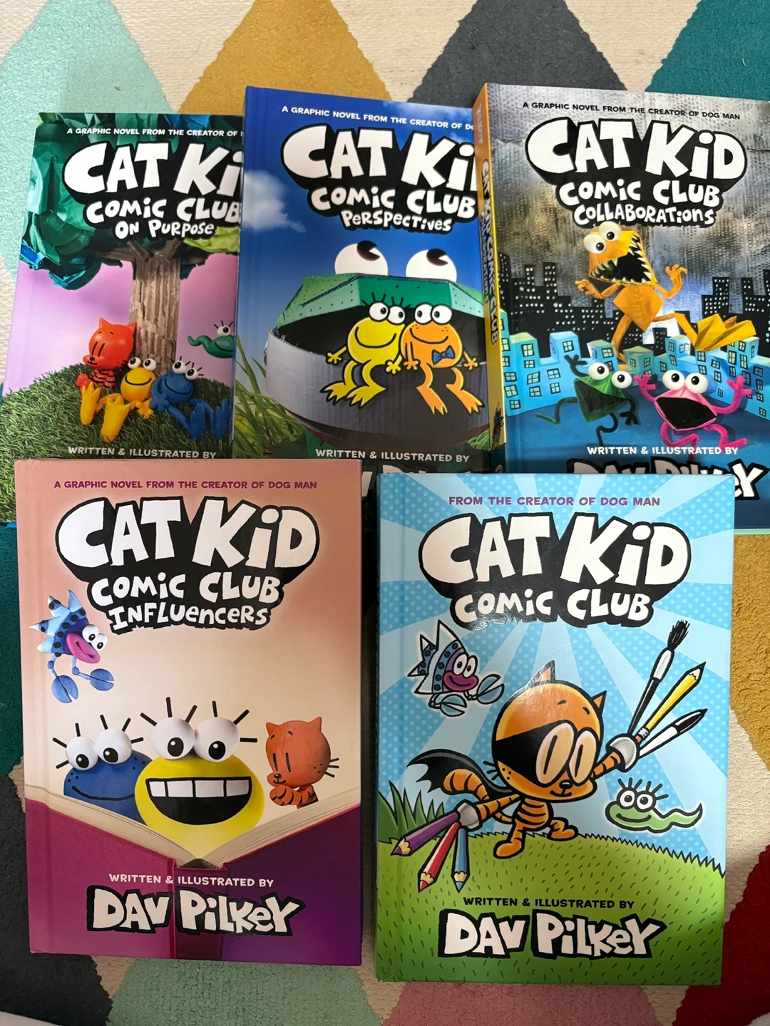 Selling a set of Cat Kid Comic Club books by Dav Pilkey! Titles include On Purpose, Perspectives, Collaborations, Influencers, and another book from the series. Perfect for young readers who enjoy graphic novels and humourous stories. Great condition and ready for a new home!