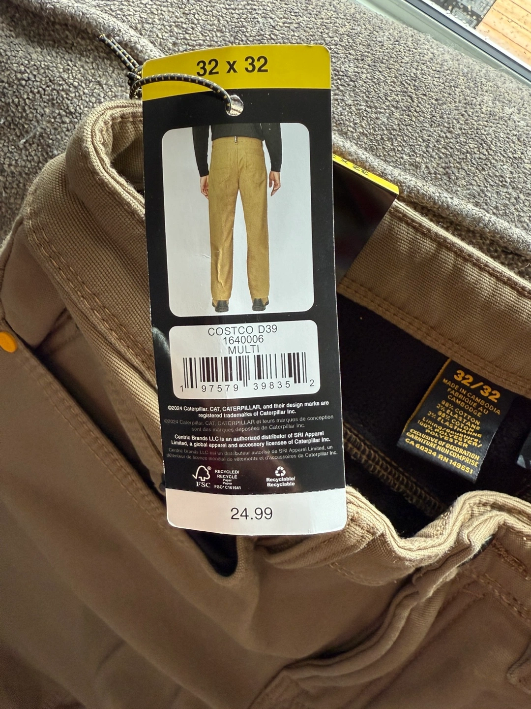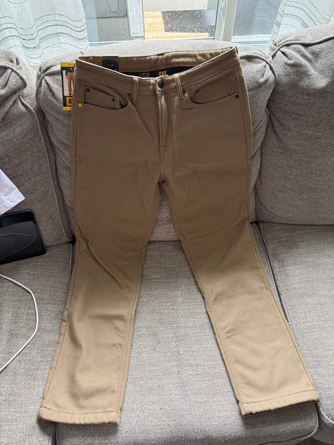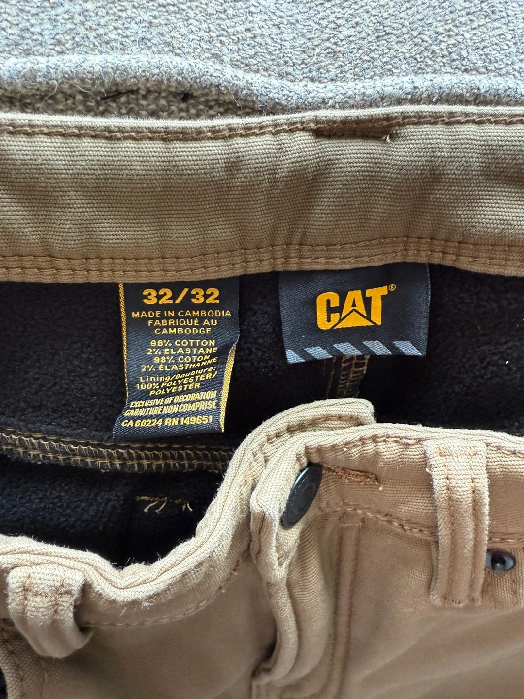 Selling a pair of CAT men's pants in size 32x32. The pants are a nice khaki colour and made from 98% cotton and 2% elastane. Originally bought for $24.99 Warm lining inside, never worn