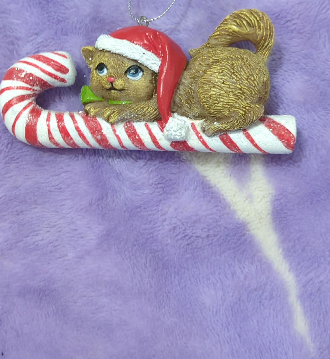 Festive cat ornament for the holidays! This cute kitty is wearing a Santa hat and riding a candy cane. Very whimsical.