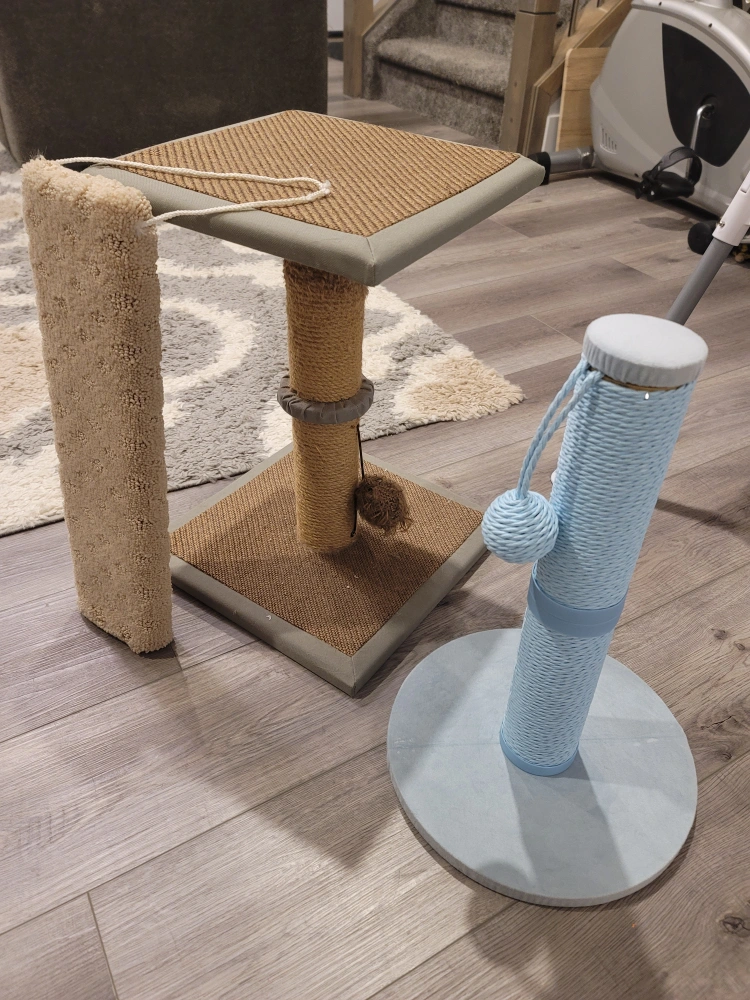 2 mini cat scratch posts and 1 pad with hanging strings. barely used by my cats. $30 for all 3