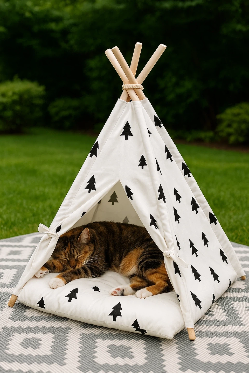 My 18lb cat was absolutely OBSESSED with this tent. Unfortunately she has a 3-4 month time frame on her obsessions. She’s over it now and on to the next! Very clean. It’s been washed. This adorable cat tent bed provides a cozy and stylish space for your furry friend to relax! The tent is made of a soft, durable fabric with a cute tree print design. It comes with a comfortable cushion to ensure your cat's comfort. Perfect for any cat who loves a little privacy and comfort!