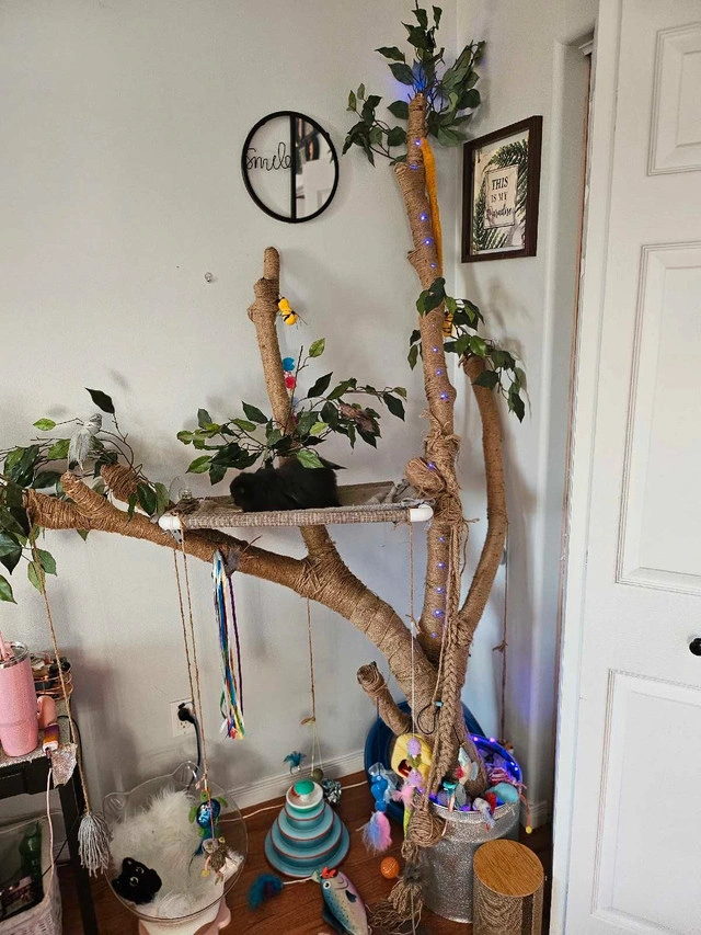 Cat tree House around 6'1/2" cats love it. Has toys attached, cat hammock, a rope to climb up . Lights with remote control