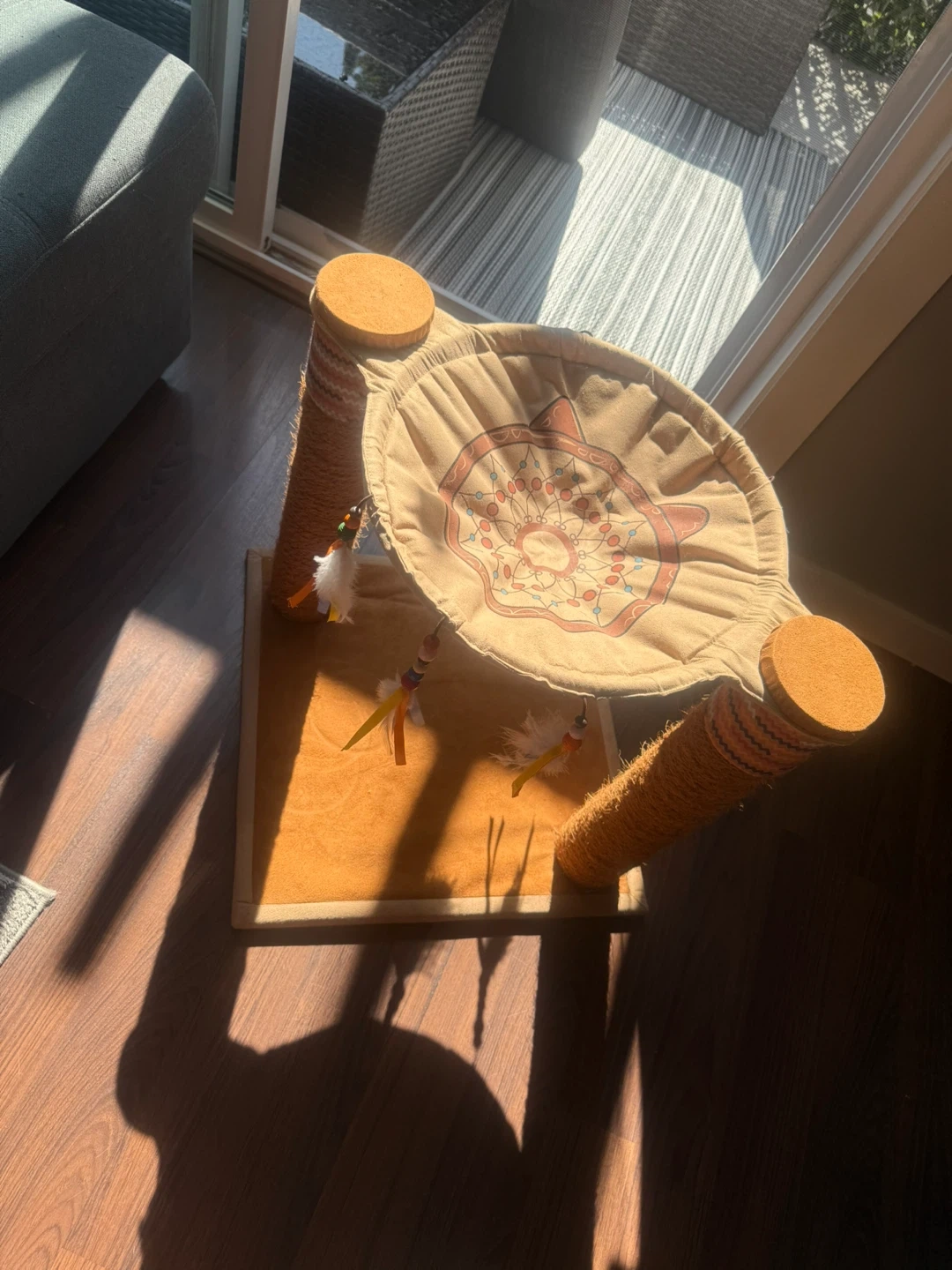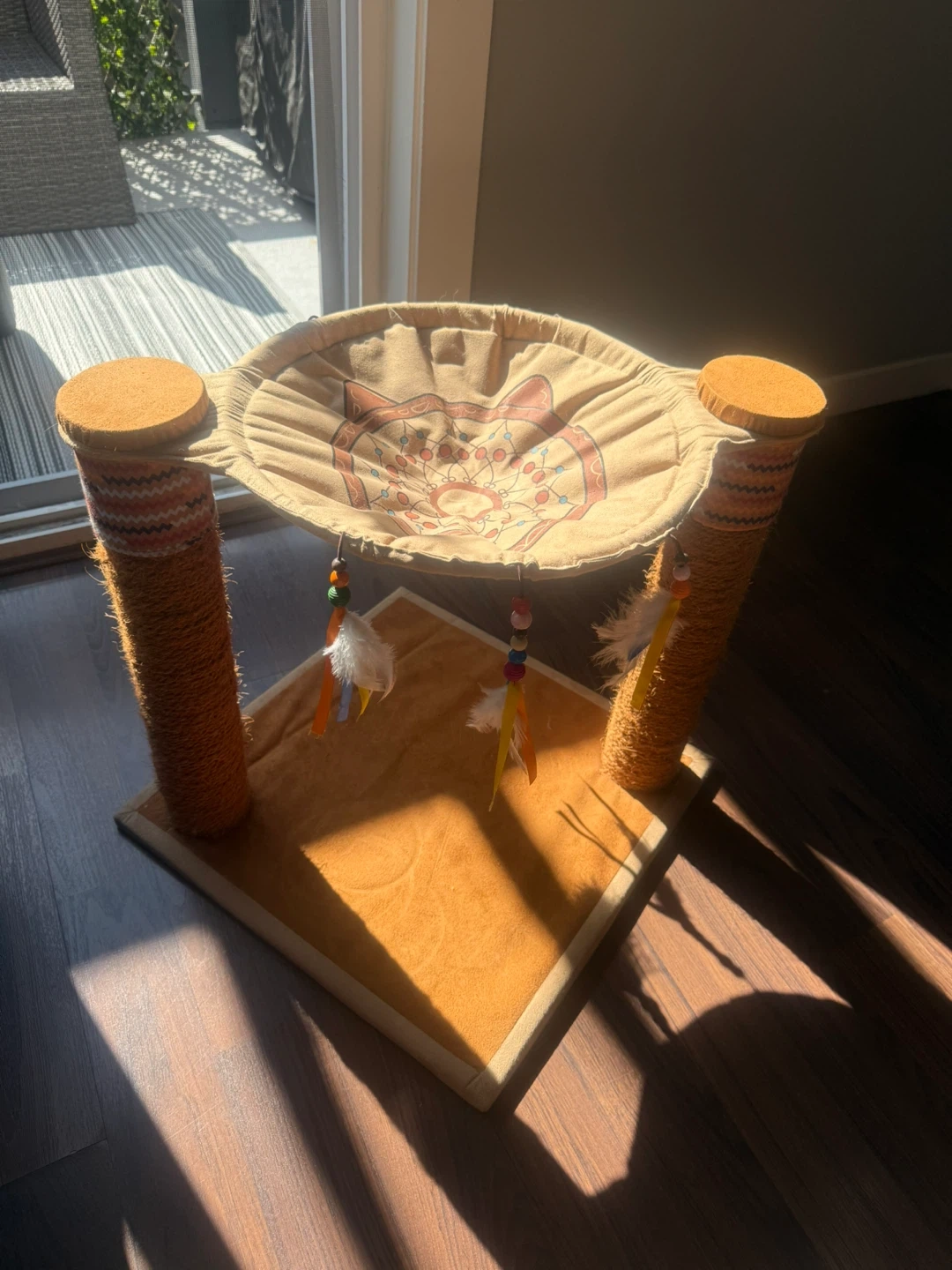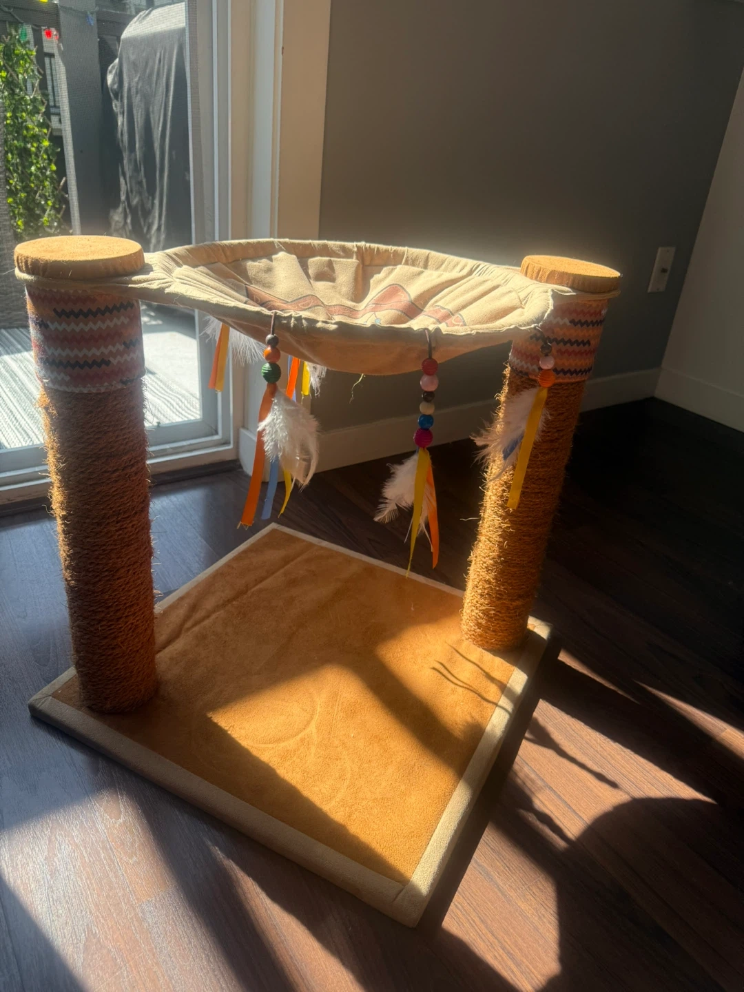 This cat tree is perfect for your feline friend! It features a cozy hammock where your cat can relax and nap, along with scratching posts to keep their claws healthy and strong. It's in great condition and ready for a new home!
