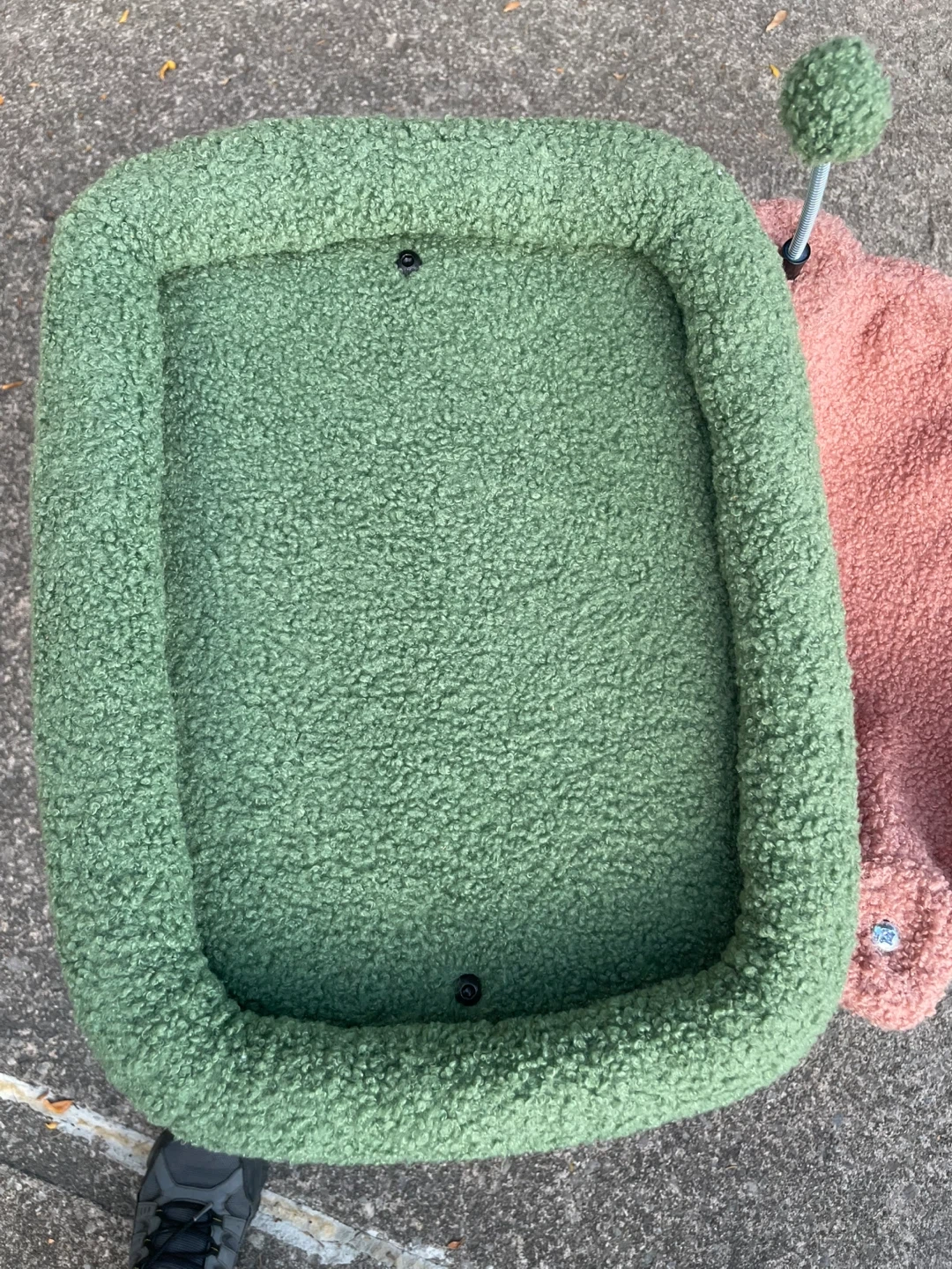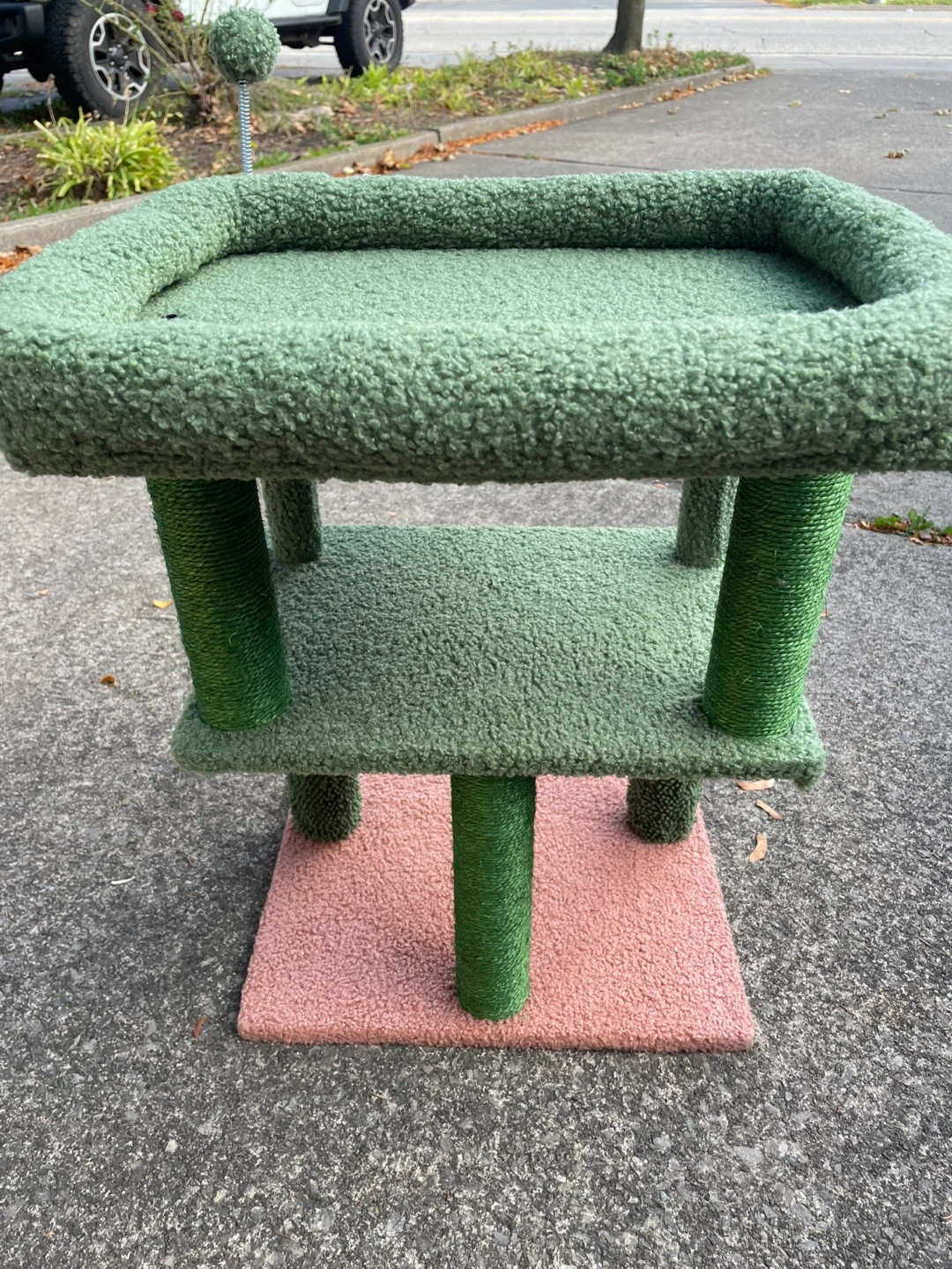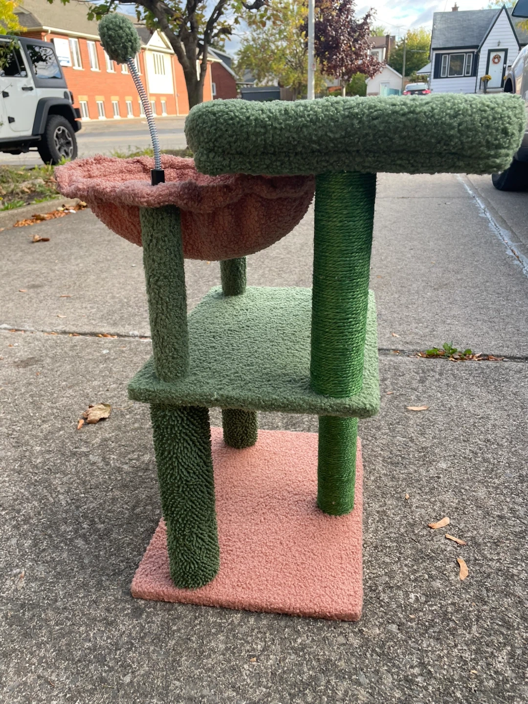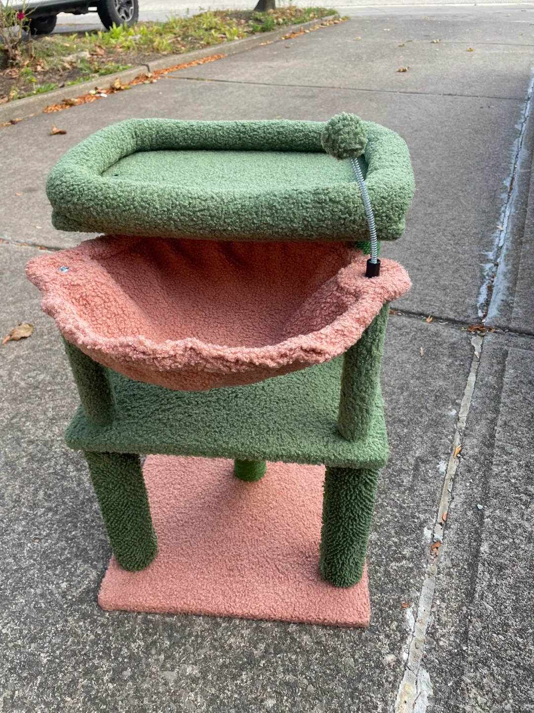 Selling a cute cat tree with a hammock! It features a cozy green bed on top and a pink hammock for your furry friend to relax in. The base and support posts are also wrapped in a soft, textured material. It's in great condition and ready for a new home!