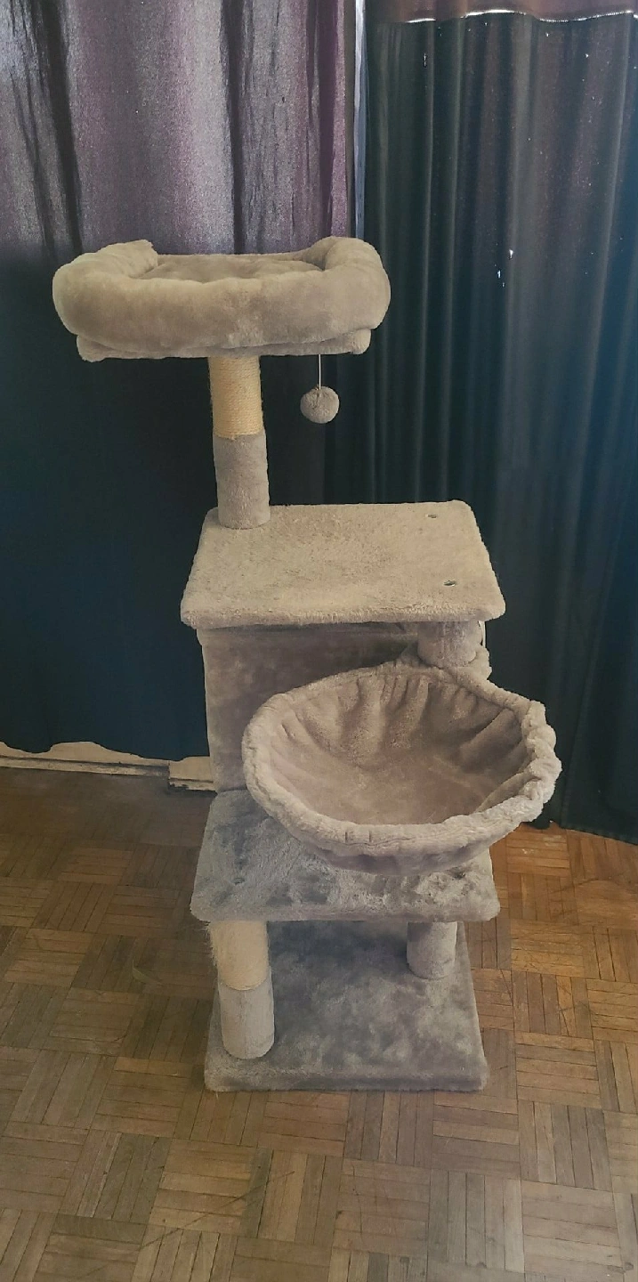 Selling a cat tree with multiple levels and scratching posts! It features a cozy bed on top, a platform in the middle, and a comfy bowl-shaped bed on the bottom for your furry friend to relax in. It's in great condition and ready for a new home