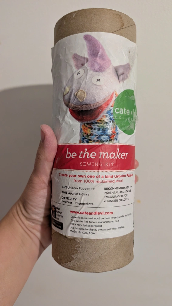 Create your own one-of-a-kind unicorn puppet with this Cate & Levi sewing kit! It includes reclaimed wool, a pattern, thread, a needle, and instructions. The kit is designed for beginner to intermediate skill levels and takes approximately 4-6 hours to complete. Recommended for ages 7+ with parental assistance. The tube is made from 100% recycled paperboard and can be used to display the puppet when finished