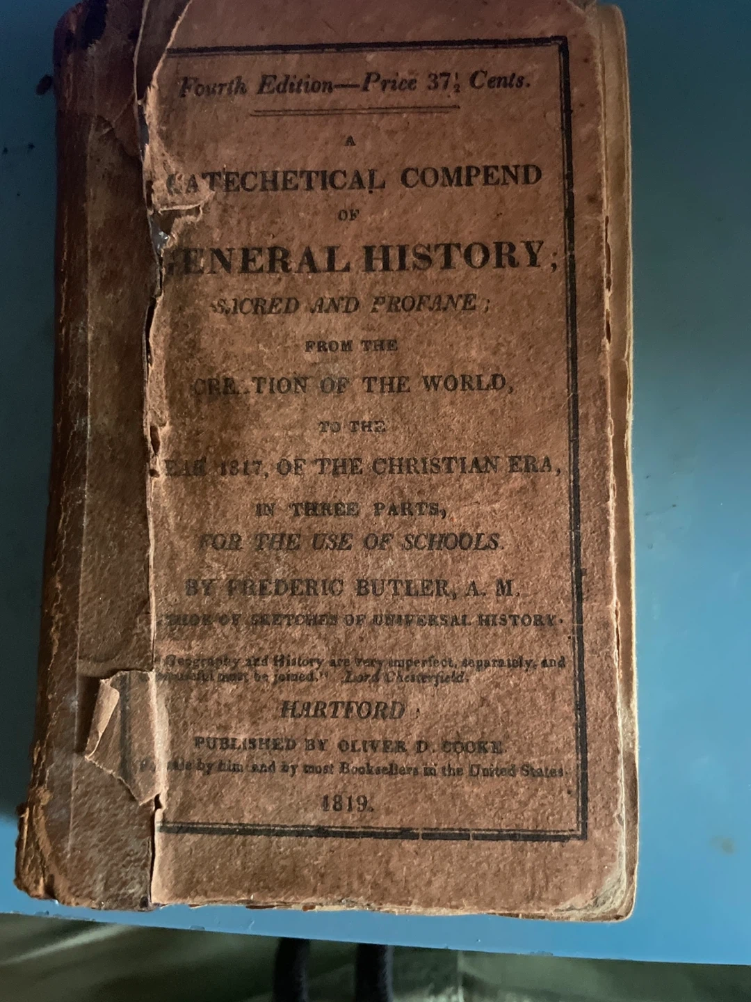 Selling a Catechetical Compend of General History, published in 1819 by Oliver D. Cooke in Hartford. This is the fourth edition, originally priced at 37 1/2 cents. It covers sacred and profane history from creation to 1817. A unique piece of history for collectors! Antique book that is 206 years old for any collectors.