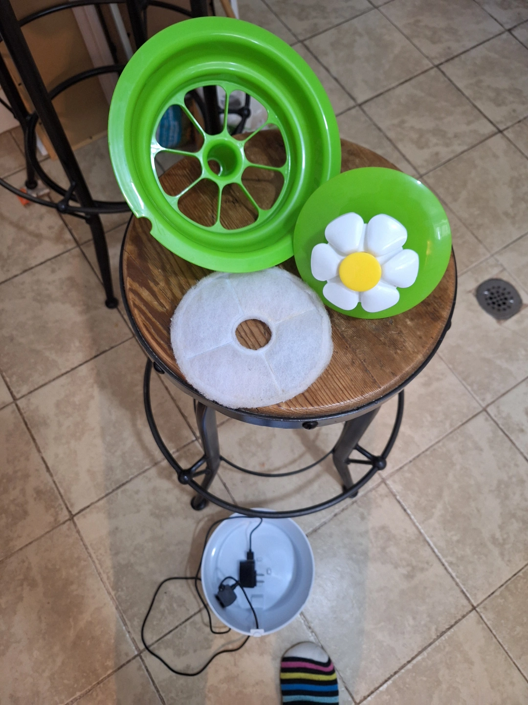 Electric pet fountain with daisy-shaped water feature. ita a good hight for cats or small dogs. All parts included. Full disclosure, my cat ignored this fountain and then it stood (turned off) gathering dust for a few months, so I reccomend giving it a good deep clean before use. I thoroughly vacuumed the filter but it might be worth l getting a replacement to be on the safe side . I also wasn't sure how to clean the pump. Open to offers!