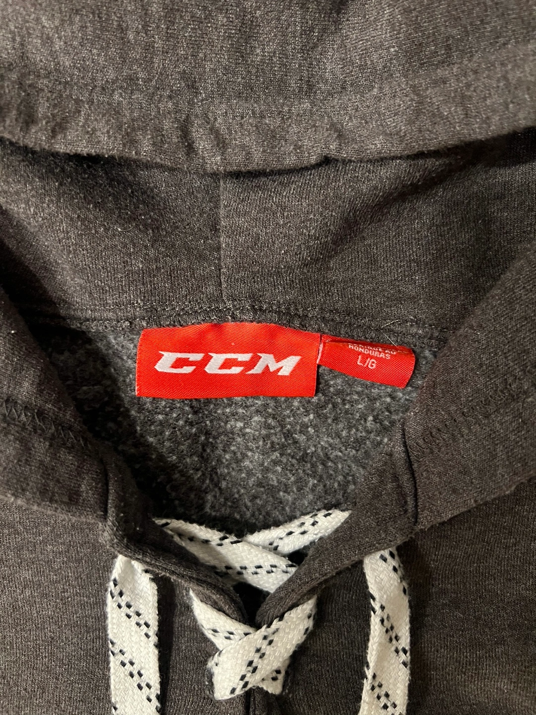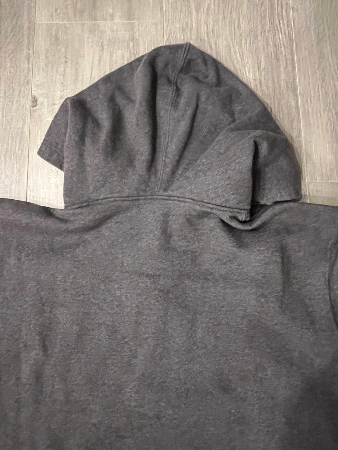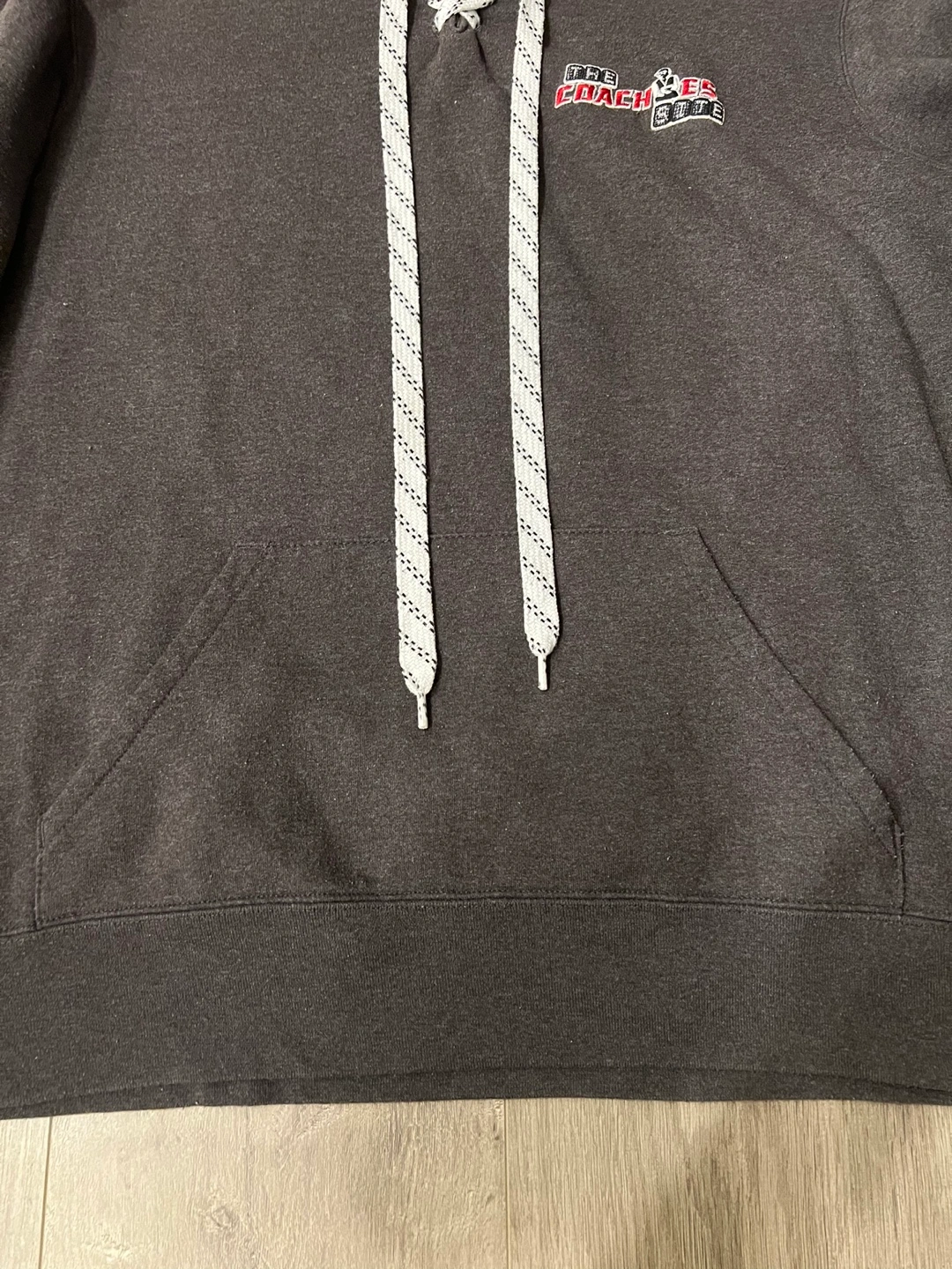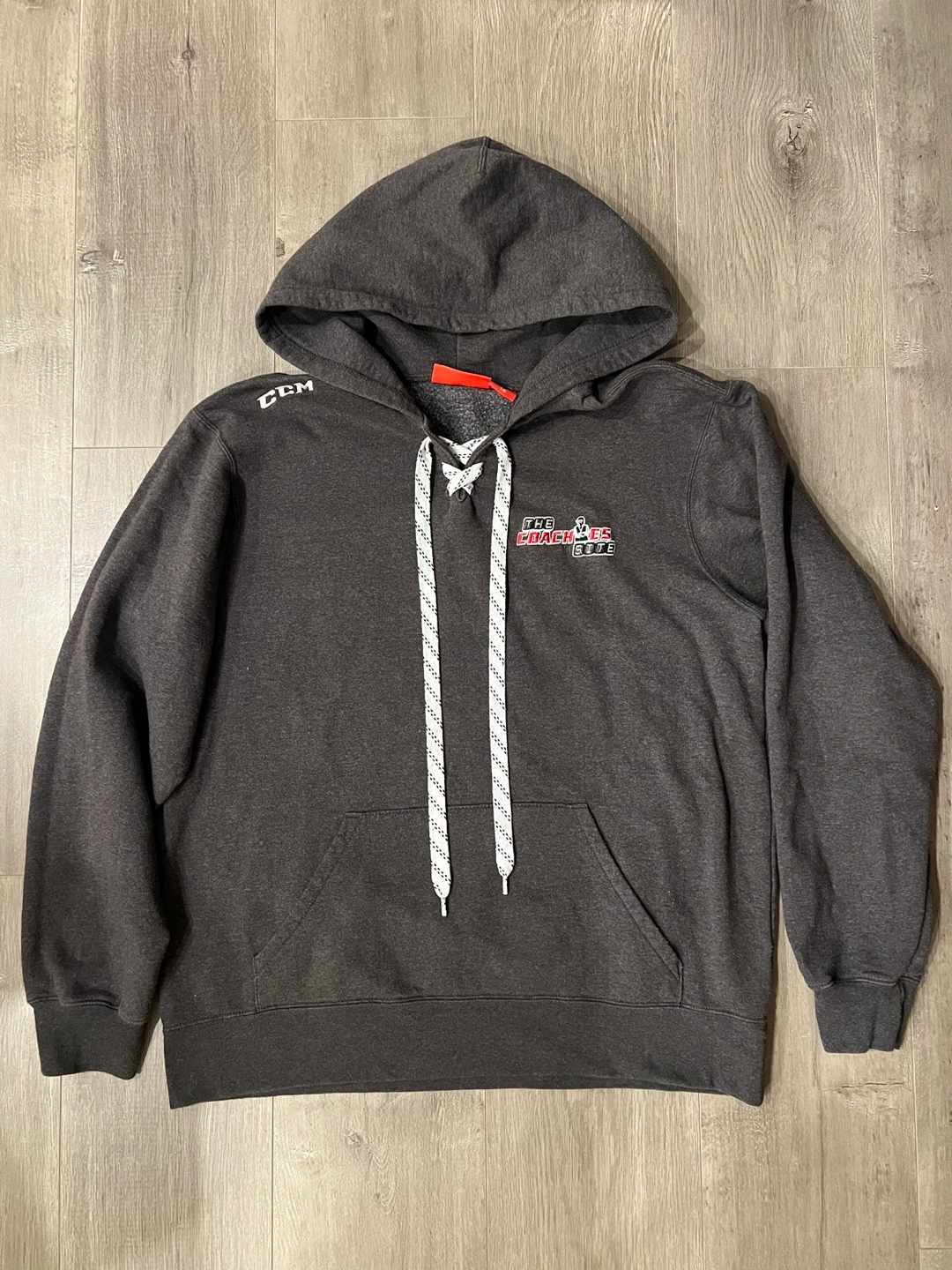 Grey sweater hoodie with white and black hockey laces. Large size.