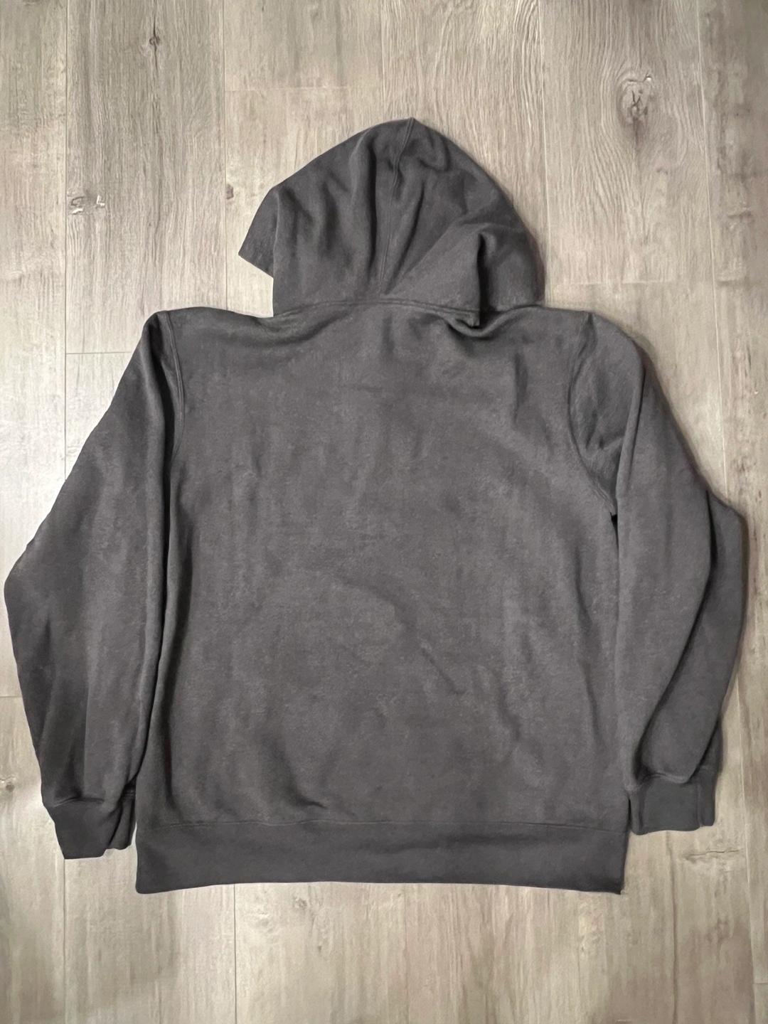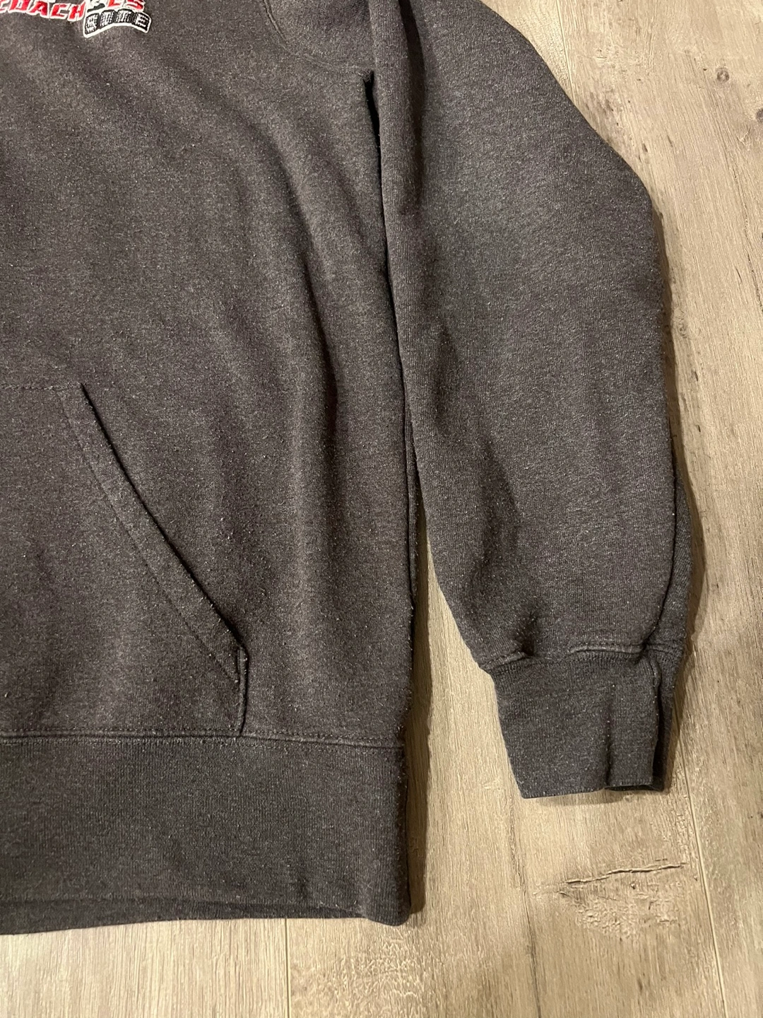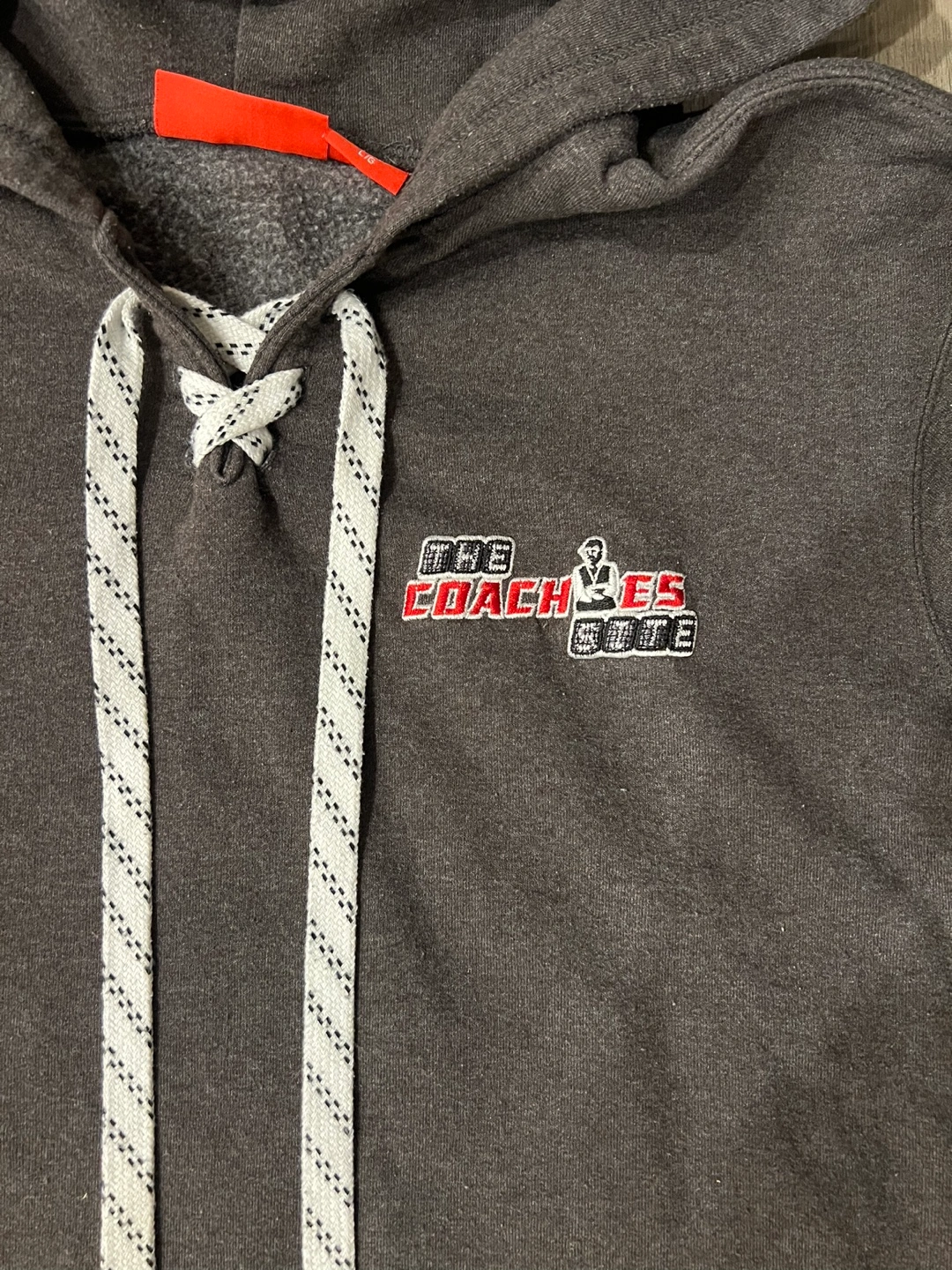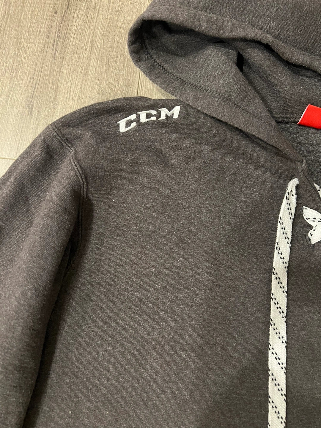 Grey sweater hoodie with white and black hockey laces. Large size.