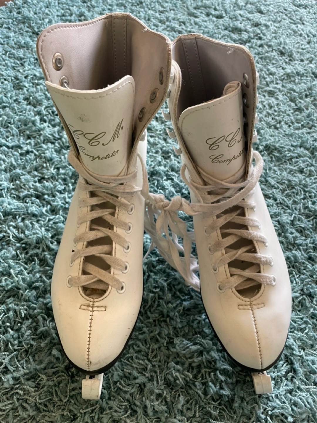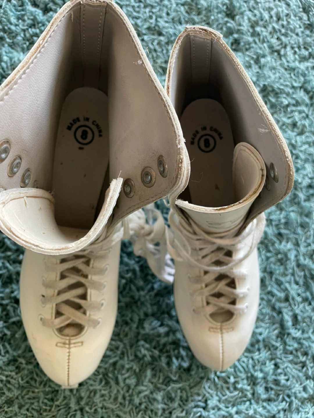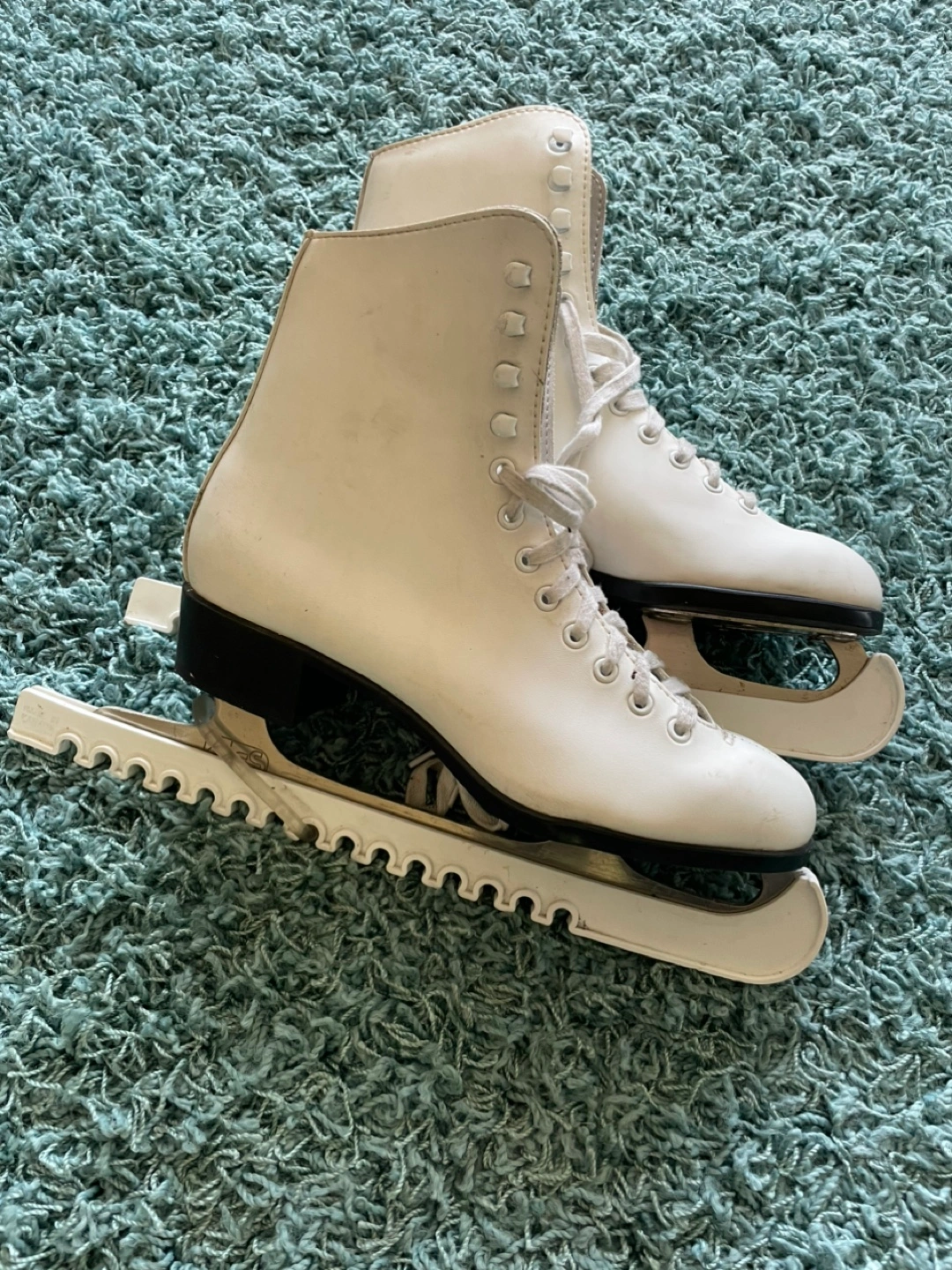 White figure skates. Lace-up design. Size 8. Impeccable condition. Comes with white skate guards.