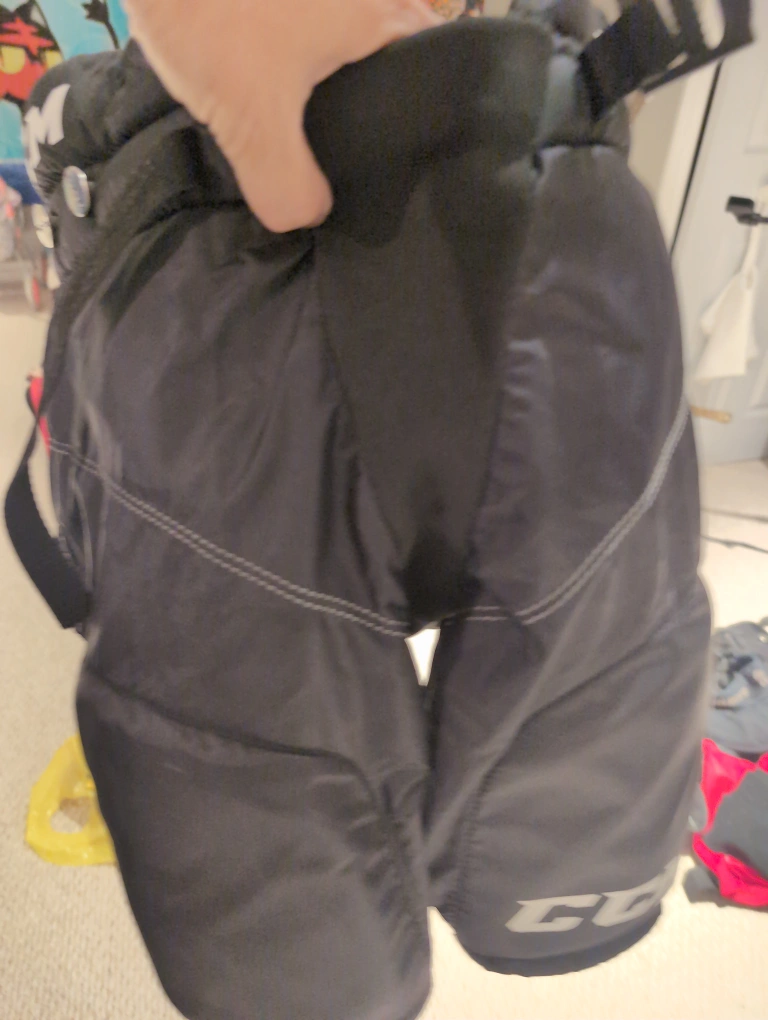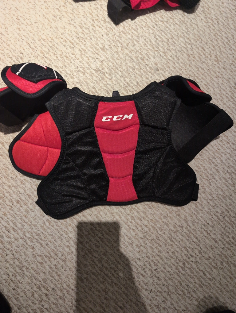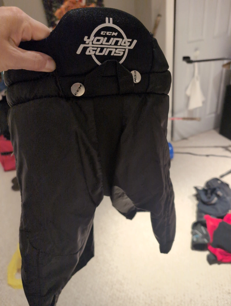 Selling a set of CCM hockey protective gear, including pants, shoulder pads, gloves, and Powertek Nitro shin pads. The pants have the CCM Young Guns logo. 120 $ for everything or 30$ for each item .