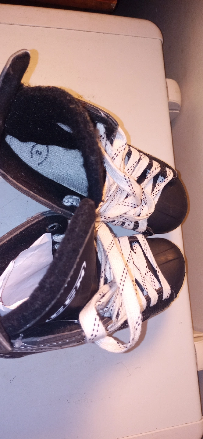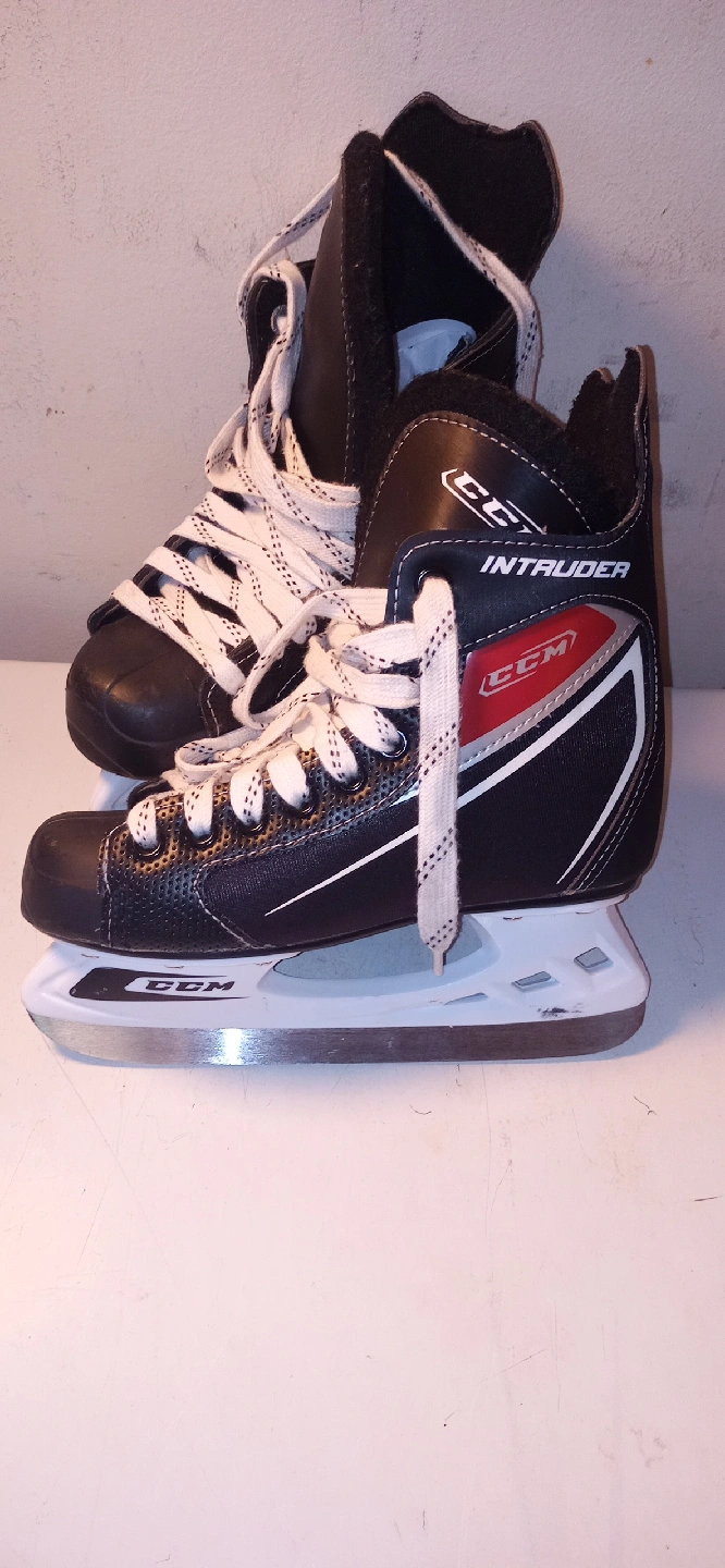 Selling a pair of CCM Intruder ice skates in size 2. They are black with white accents and in good condition. Perfect for hitting the ice!