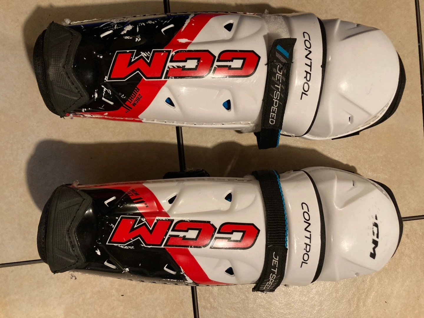 Selling a pair of CCM shin guards. They are white, red, and black and in used condition. The size is 11 inches.