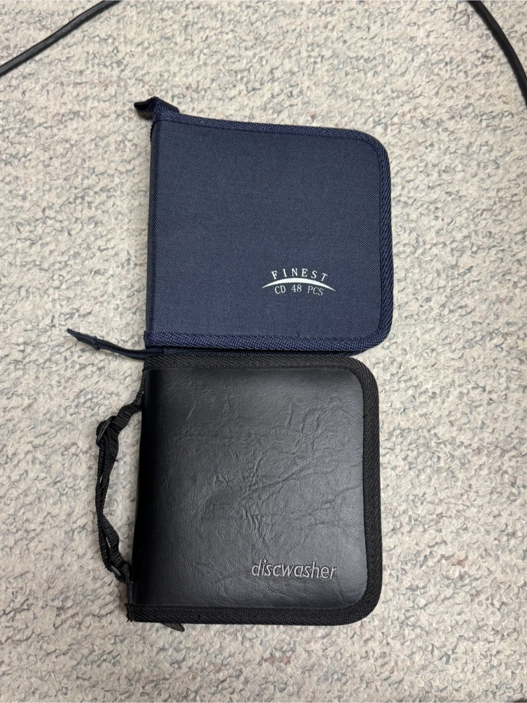 Two CD cases for sale! One is a blue Finest CD case that holds 48 CDs. The other is a black Discwasher case that holds 12 CDs.