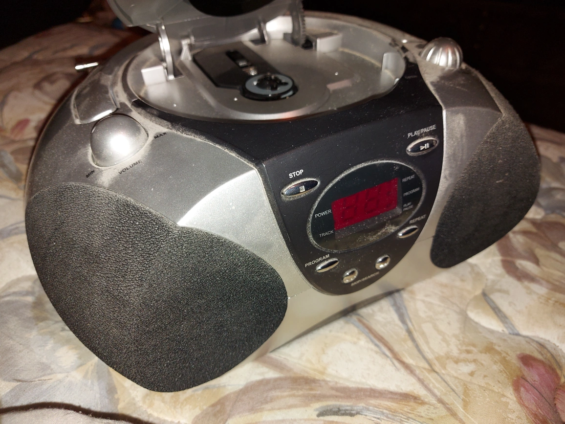 Selling a used CD player boombox. It has a digital display and buttons for play/pause, stop, repeat, program, track, and volume control. It could use a bit of cleaning, but it works!