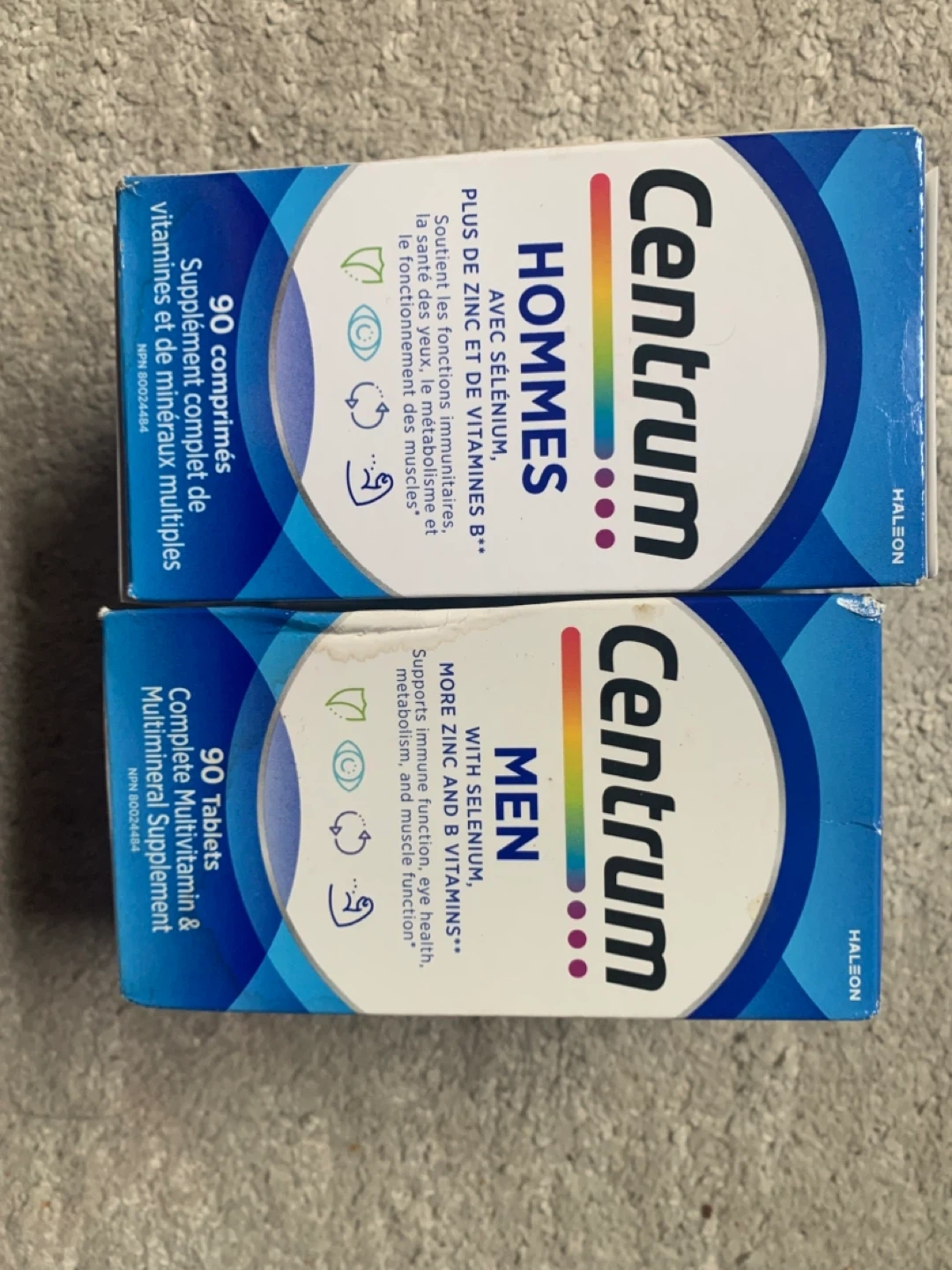 Each box $10 Selling a box of Centrum Men multivitamin tablets. Each box contains 90 tablets, a complete multivitamin and multimineral supplement designed to support immune function, eye health, metabolism, and muscle function. It includes selenium, zinc, and B vitamins.