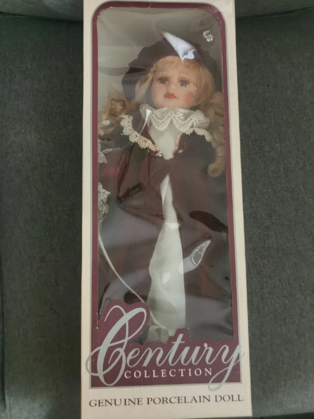 This is a Century Collection genuine porcelain doll. It comes in its original box. The doll is wearing a burgundy dress with white lace trim and a matching hat. A beautiful addition to any doll collection!
