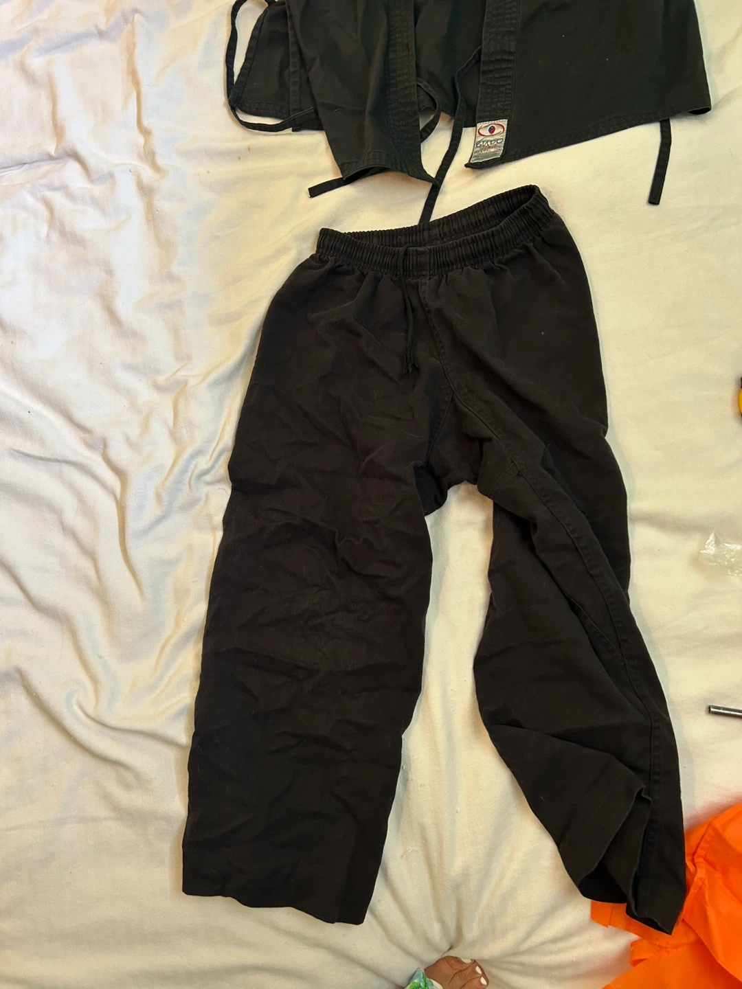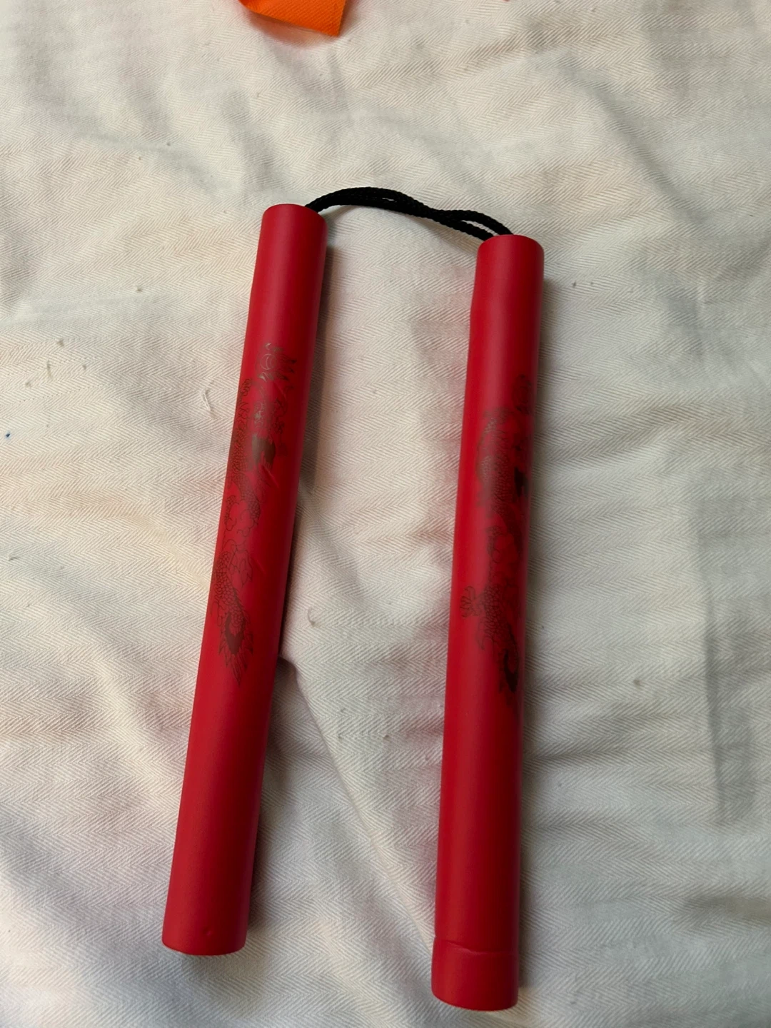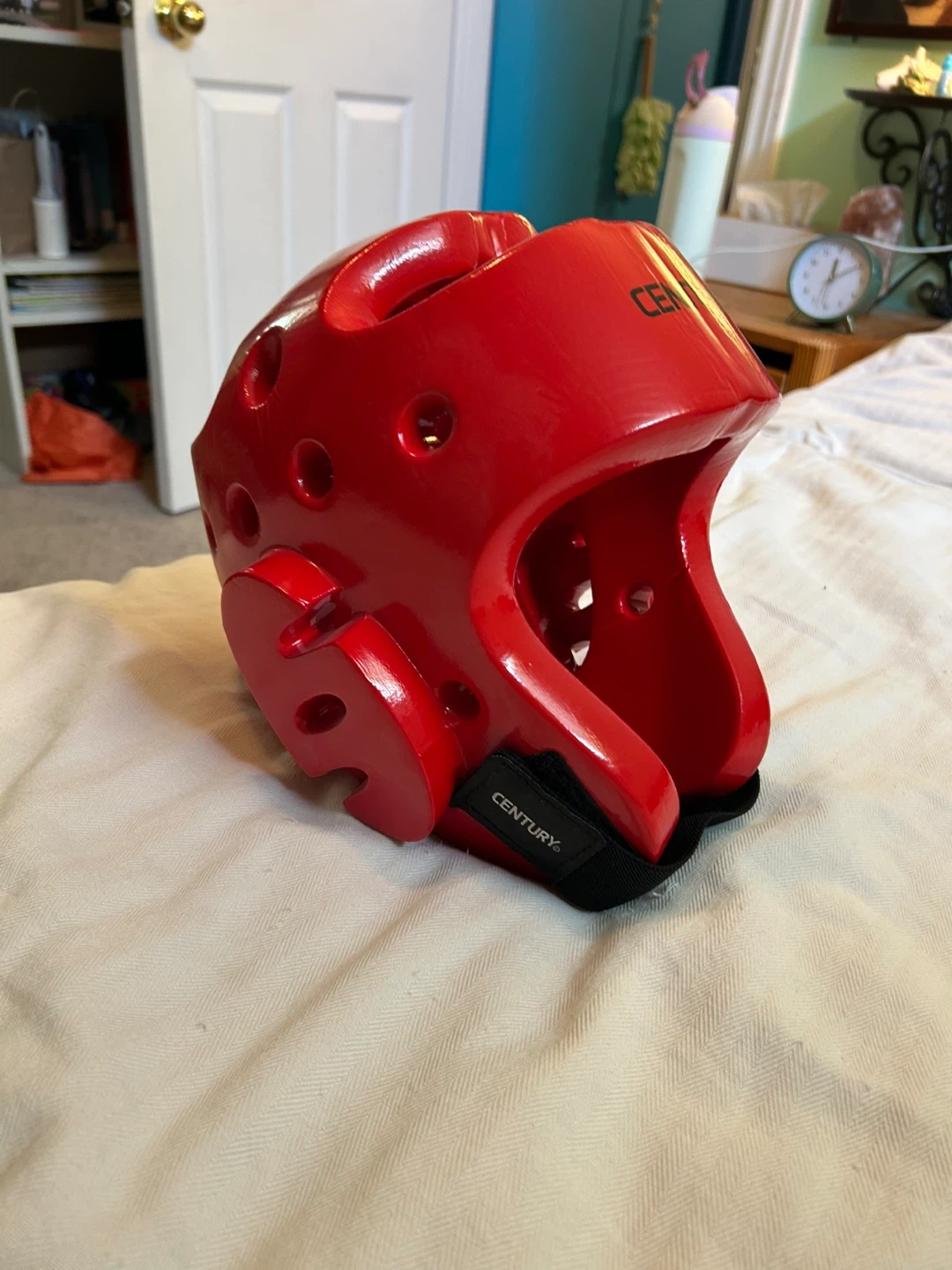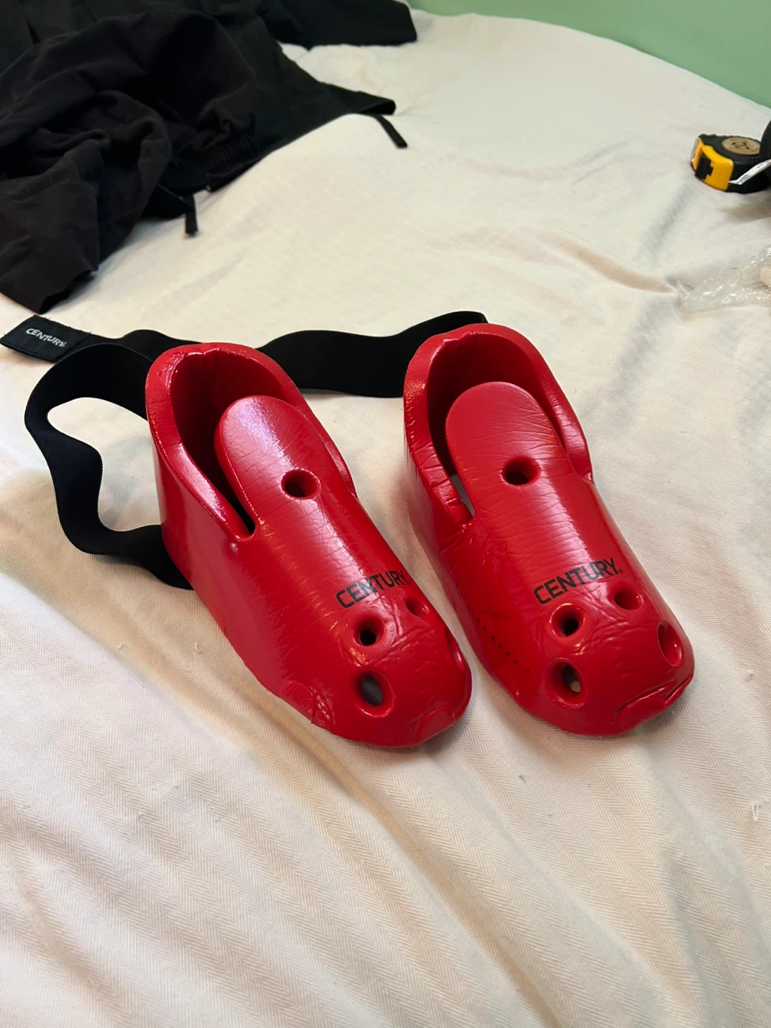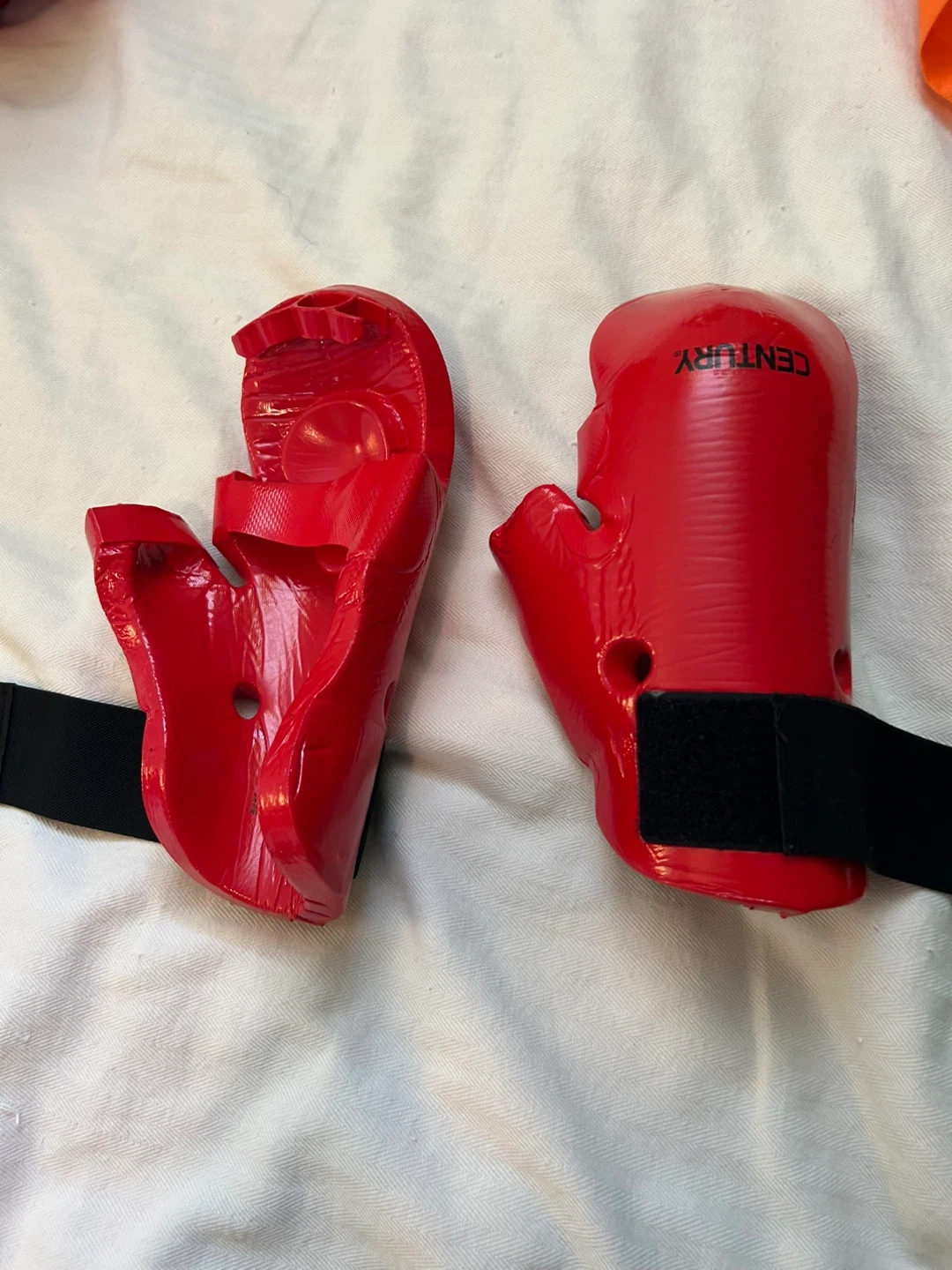 Selling a martial arts gear set by Century! Includes hand protectors, foot protectors, nunchucks, a uniform, and a head protector. All in a vibrant red colour. Great for training!