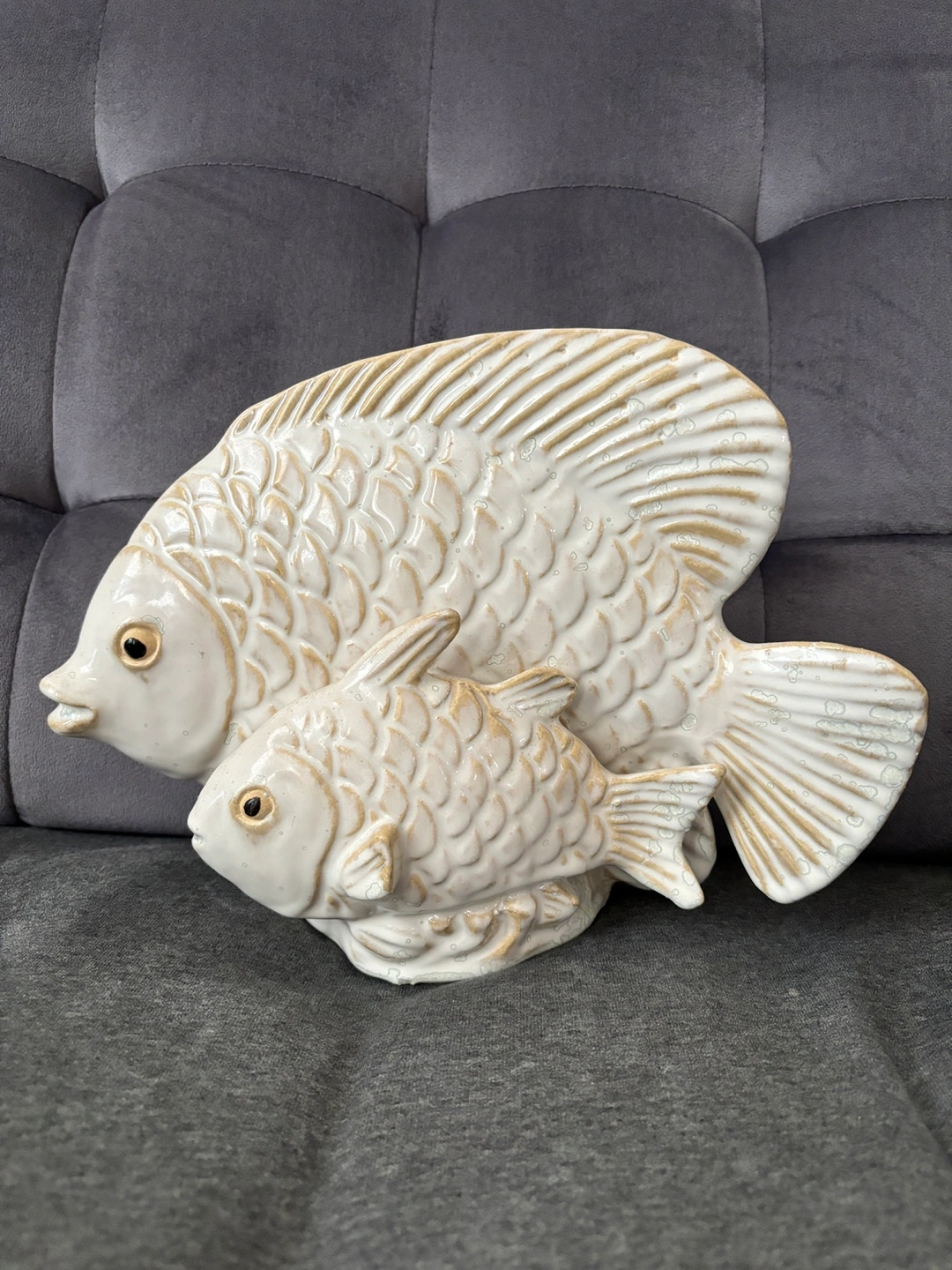 Adorable ceramic angelfish sculpture. Off-white with beige detailing. Two fish, one large and one small. Great home decor piece. Approximately 7 inches tall.