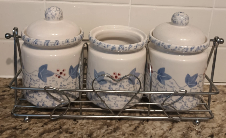 Set of three ceramic canisters with lids. Includes a metal stand with a heart design.
