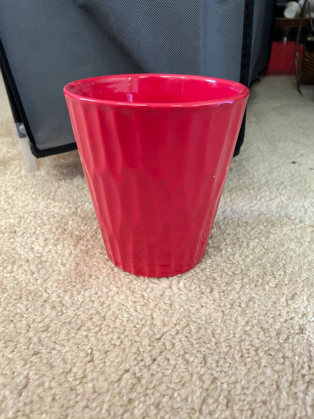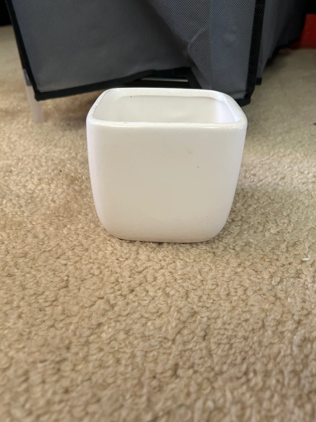 Selling a few assorted ceramic flower pots. There is a red pot, a black pot with blue circles, and a white square pot. They're perfect for small plants or succulents! $5 each.