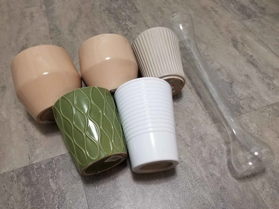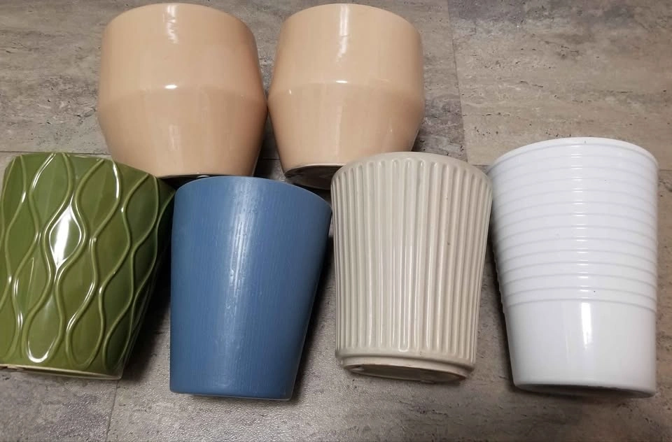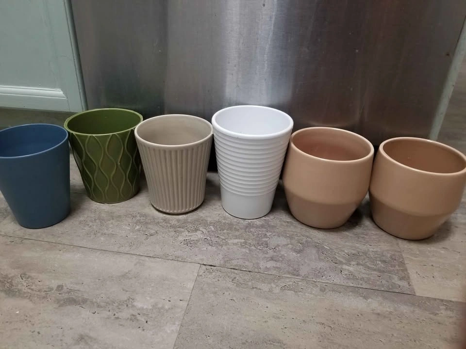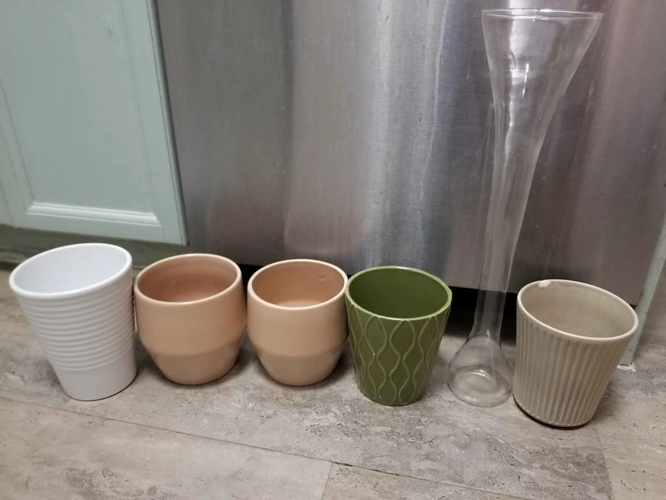 All for $5. 5 ceramic plant pots, 1 plastic and a tall thin glass vase. 2 pots have slight chips. Located in the Hunt Club Park area near Conroy and Johnston road