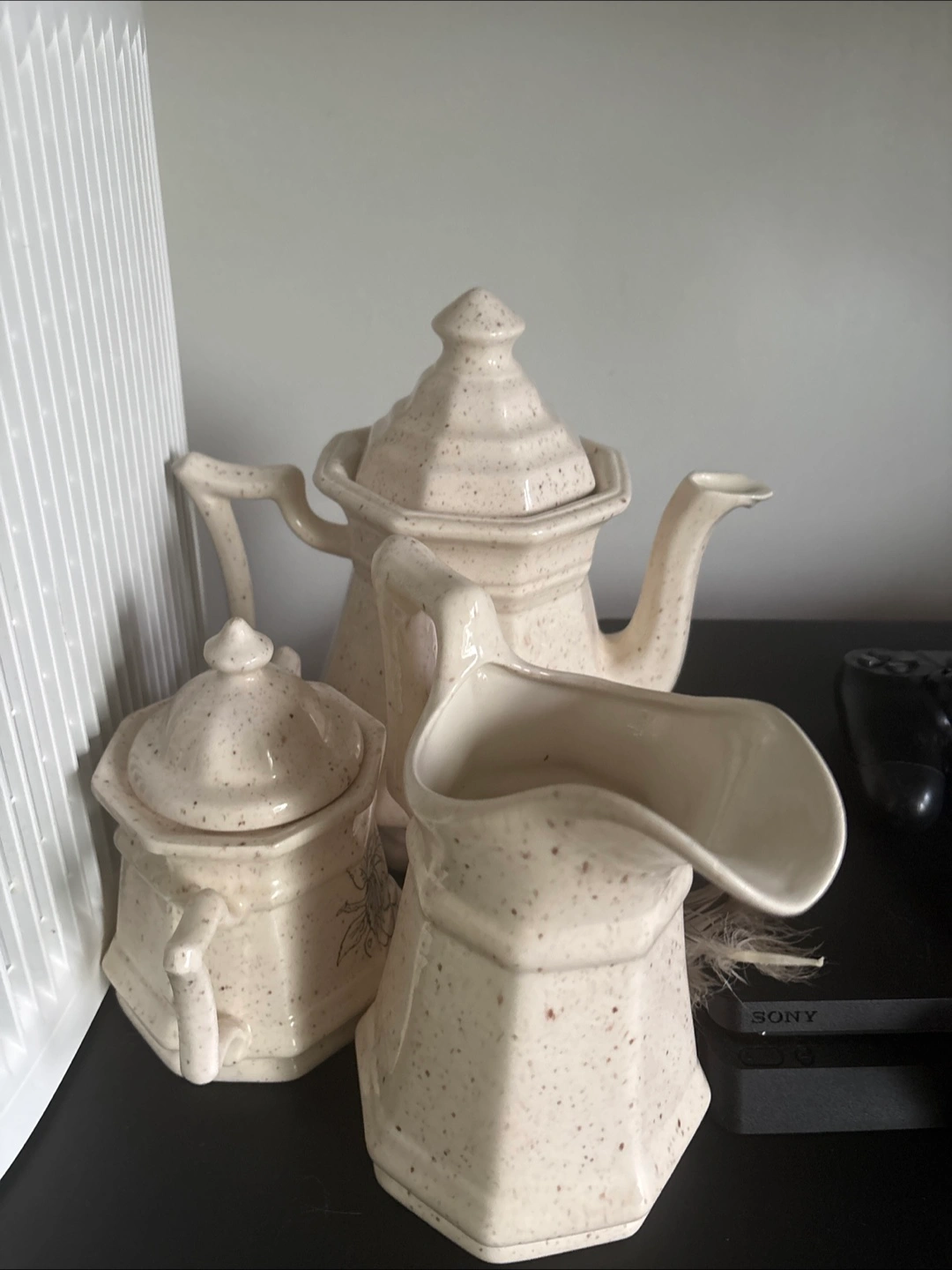 Selling a lovely ceramic tea set! Includes a teapot, a sugar bowl with lid, and a creamer. The set is a speckled off-white colour and would look great in any kitchen or dining room. Perfect for tea parties or everyday use!