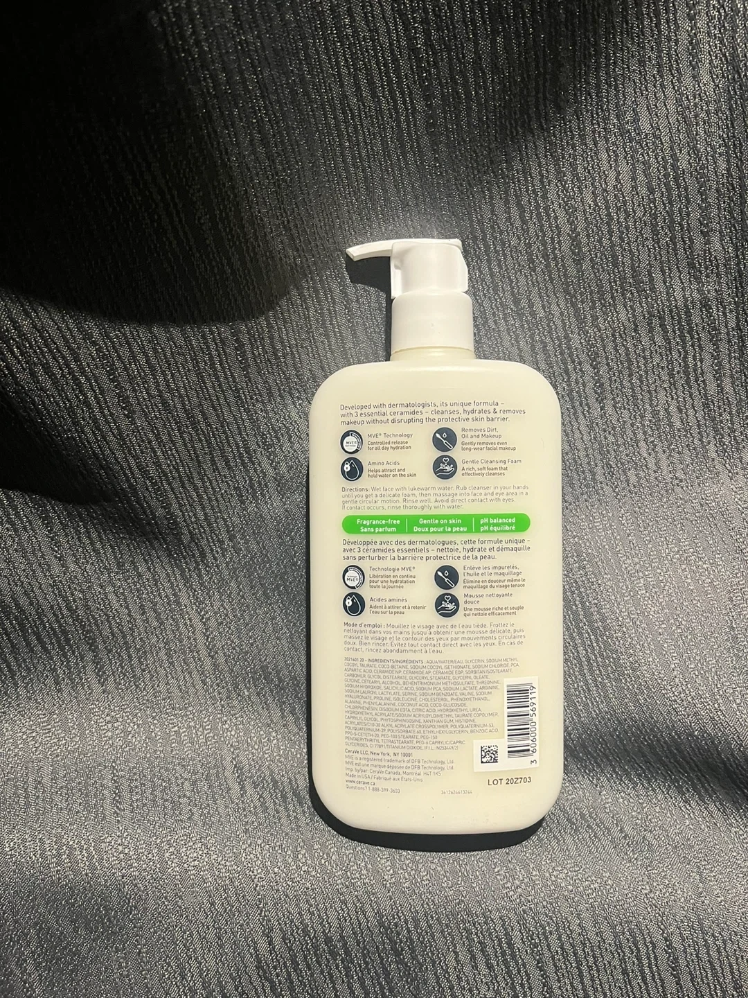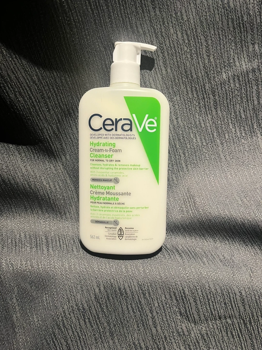 Selling a bottle of CeraVe Hydrating Cream-to-Foam Cleanser. This cleanser effectively removes makeup and leaves your skin feeling refreshed. It's formulated with amino acids and three essential ceramides to help maintain the skin's natural barrier. It's fragrance-free, making it suitable for sensitive skin. The bottle contains 562ml.