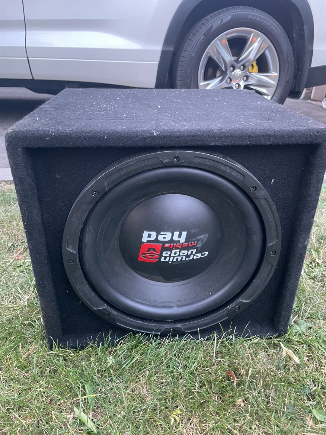 Selling a Cerwin Vega car subwoofer. It's black and in good condition for its age. Great for adding some serious bass to your car audio system!