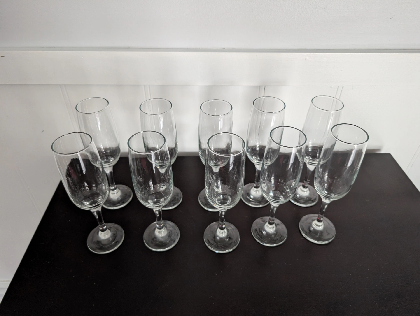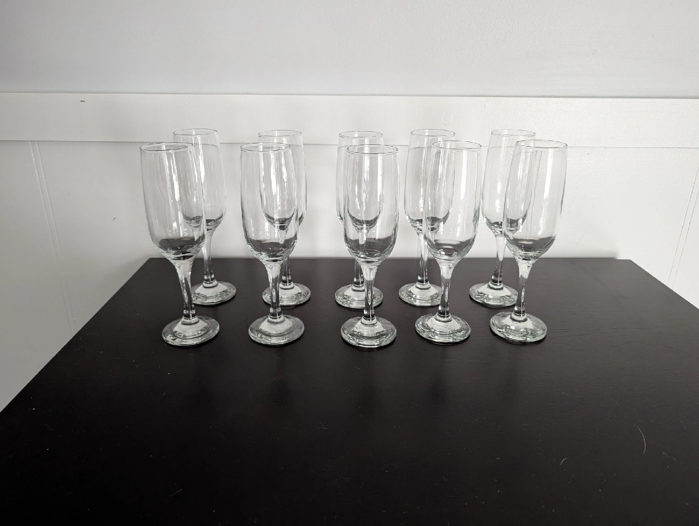 Selling a set of 10 champagne flute glasses. They're in great condition and perfect for celebrations or everyday use. They are clear glass with a classic flute shape.