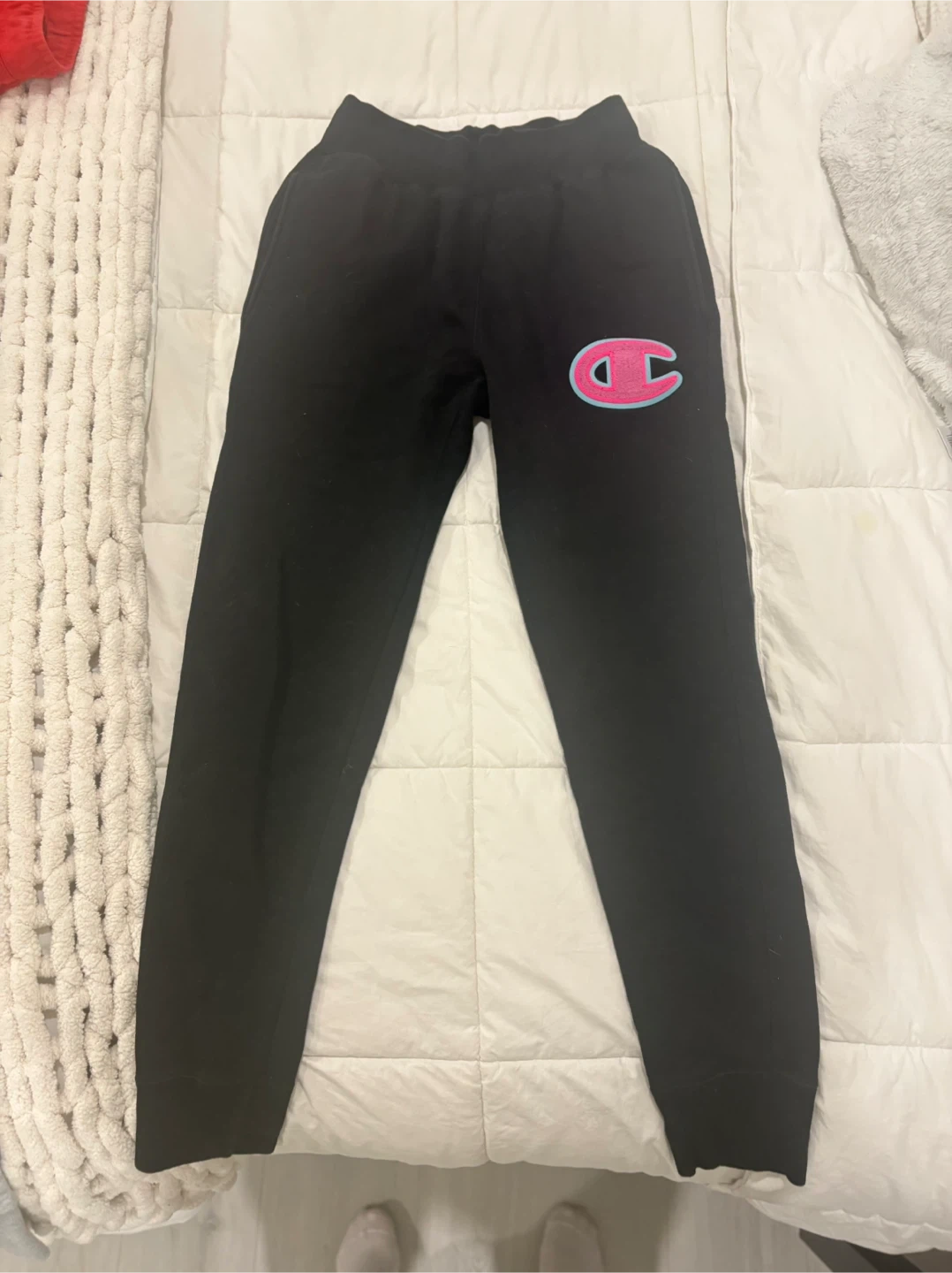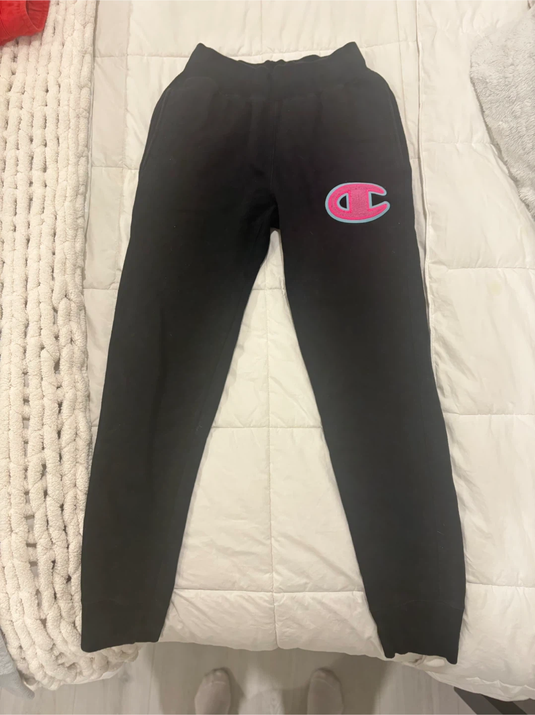 Selling a pair of Champion sweatpants in black. They feature the classic Champion logo on the leg. Perfect for lounging or working out!