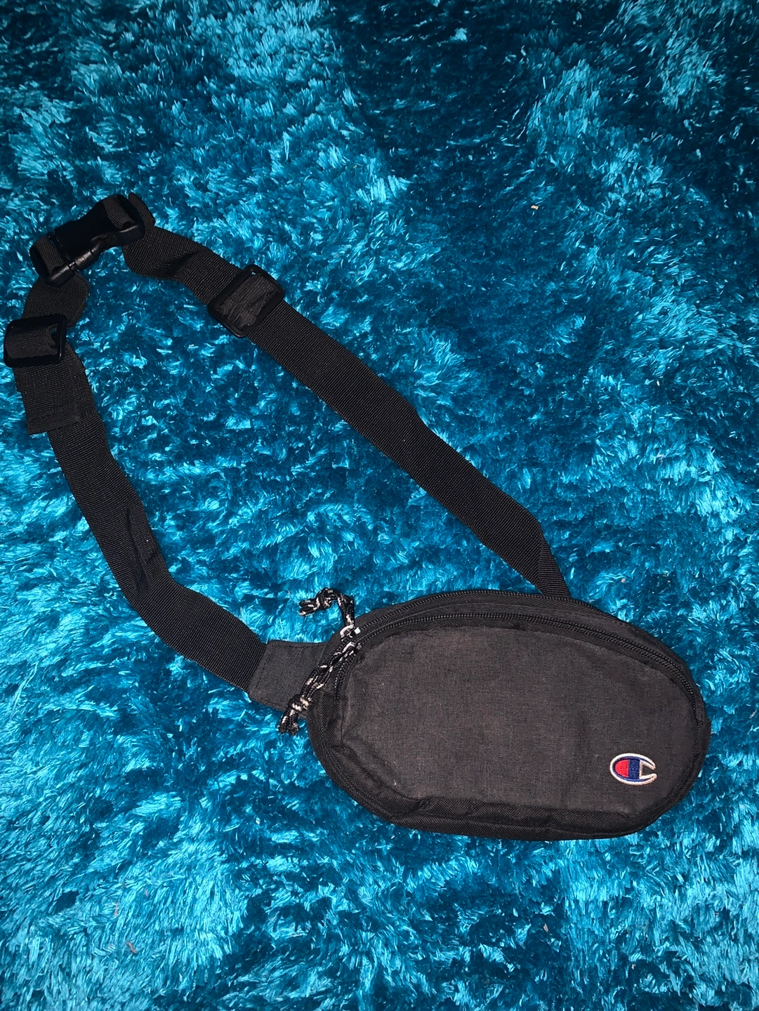 Black fanny pack with adjustable strap. Features a zipper closure and small front pocket. Perfect for festivals or everyday use. There is a small Champion logo patch on the front. Unisex.